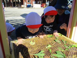 戸外遊び(0歳) 2018 11/19 ニュース 天気の良い日は戸外で元気に遊んでいます。好奇心いっぱいの時期。木のザラザラの感触を夢中になって味わっていました。 イチョウの葉を見つけてたくさん並べて遊んでいました。保育士の「いらっしゃいませ〜」言葉を聞いて「ど~ぞ!」とやりとりを楽しんでいます。 ニュース URLをコピーしました! 救命講習 お楽しみ弁当(1歳児) コメント コメントする コメントをキャンセルコメント ※ 名前 ※ メール ※ サイト 次回のコメントで使用するためブラウザーに自分の名前、メールアドレス、サイトを保存する。 Warning: Trying to access array offset on false in /home/c3936434/public_html/taisei.ac.jp/tgnn/wp-content/plugins/siteguard/really-simple-captcha/siteguard-really-simple-captcha.php on line 353 上に表示された文字を入力してください。 Δ