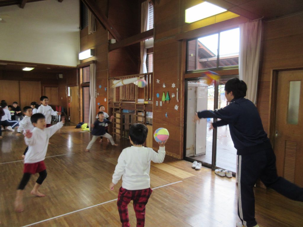 中学生が手作りおもちゃを持って、遊びにきてくれました。大きいお兄さん、お姉さんたちに、子どもたちは大喜び!!なかでもコマ回しのコツを教えてもらったことに感激していました。魚釣りやキャッチボールをしたりとたくさん触れ合い、楽しい時間があっという間に過ぎて別れを惜しんでいました。