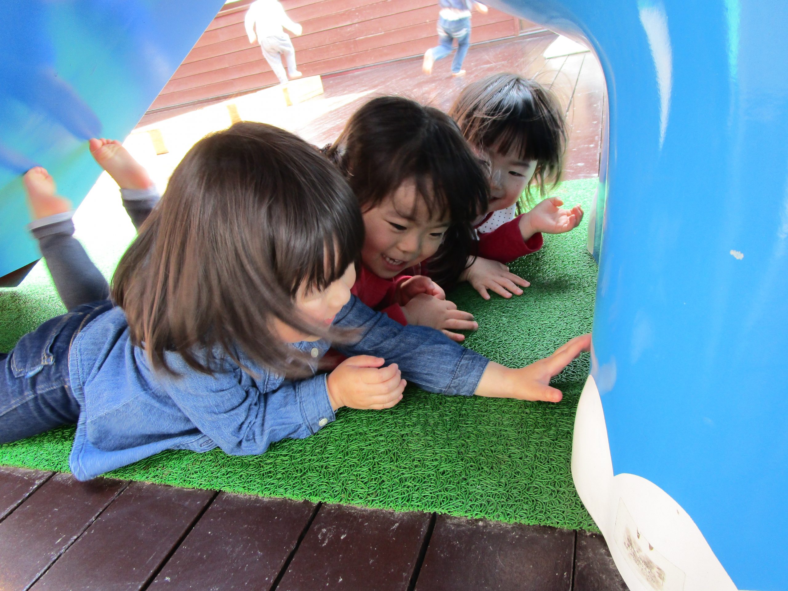 「いれて~、いいよ~」ぞうさん滑り台の下にみんなで隠れると楽しいね。