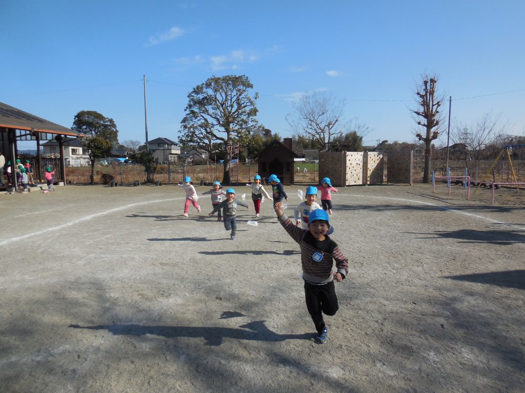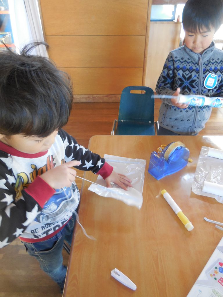 年長さんのたこを見て、「作りたい!」と制作がはじまりました。年長さんみたいに大きいたこは作れないから…「小さいのにしよう」と作りはじめ、「このたことぶかなぁ~?」と友達とワクワクしながら制作していました。完成すると園庭中を走り回りたこ揚げをしました。