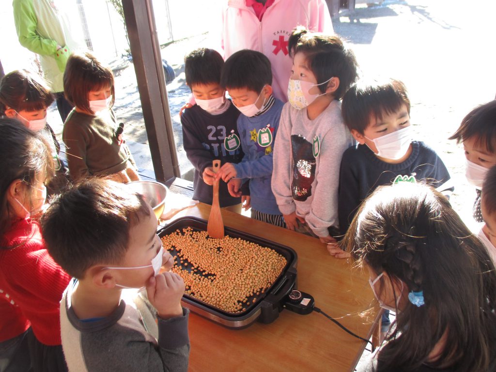 年長さんが、「どうしていった豆をまくのかな?」「やいかがしは何のために飾るのかな?」「なんか匂うね。」などと話しながら豆をいってくれました。