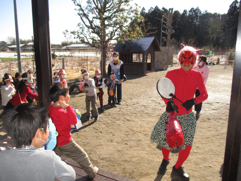 パーティーでは、年長さんが追い出したい鬼を発表したり、みんなでゲームをした後、年の数+1個の豆を食べました。太鼓が音なり鬼が登場すると、大きな声で「鬼は~外!!」と豆をぶつけ鬼を退治しました。