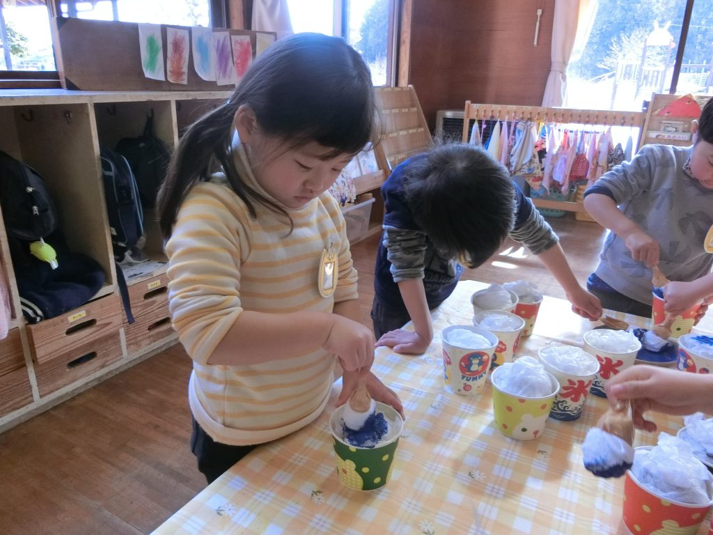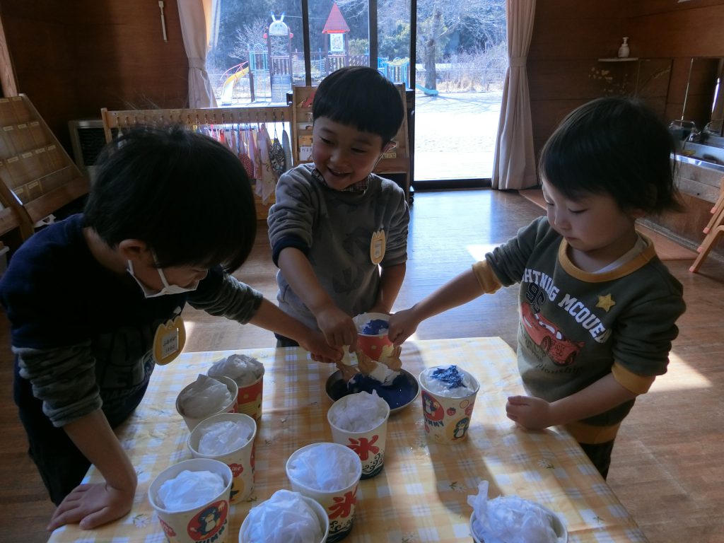 寒い日に、霜を見つけた事からイメージを広げて楽しんできたかき氷ごっこ。 かき氷のシロップもかけたい!と絵具のシロップをかける事になりました。 味は、みんなの中で人気だったベスト3!いちご!メロン!ブルーハワイ!に決まりました。 「おいしそう~」「早く乾くといいね」と、シロップのかかったかき氷で遊ぶのを楽しみにしているつき組さんです。