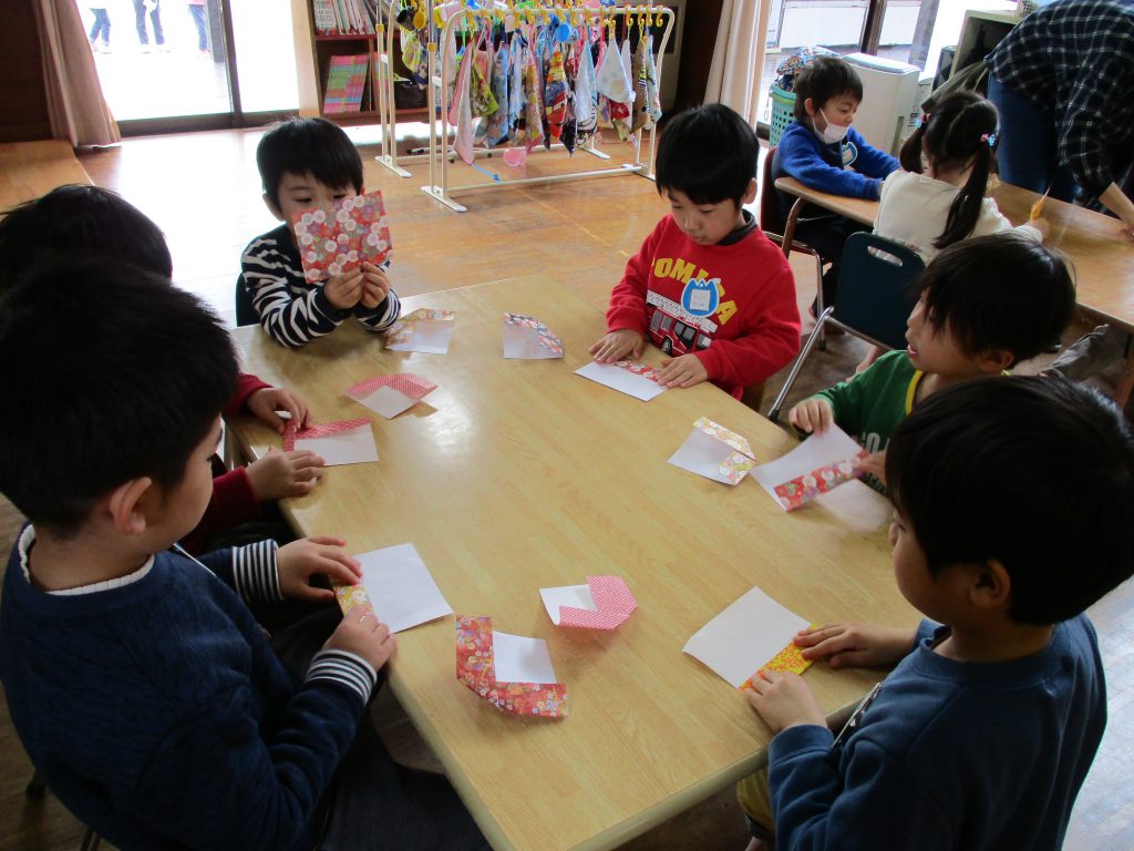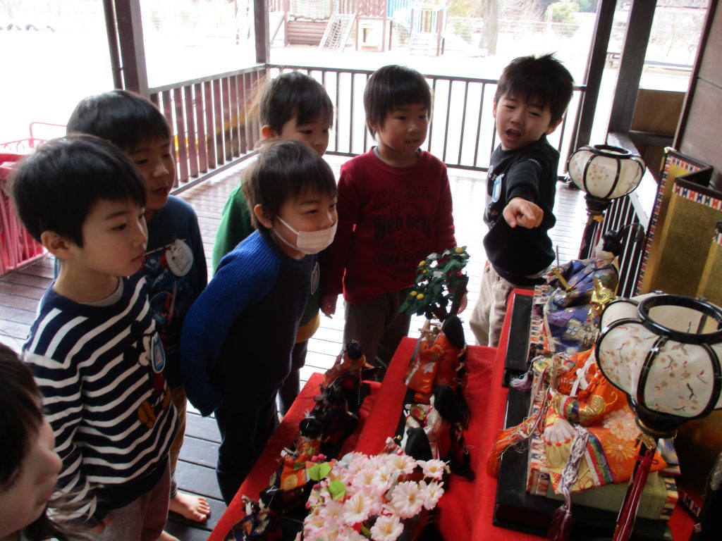 ひなまつり会に向けて、おひな様づくりが始まりました。おりがみで、おだいり様とおひな様を作り、クレヨンで顔を描こうとした時、ひなまつりの歌を思い出し「すまし顔?ってどんな顔??」と考えるそら組さん。すると、園に飾ってあるひな飾りのところへ行き、じ~っとその顔を見て、「この顔のことか!!」と発見があったようです。