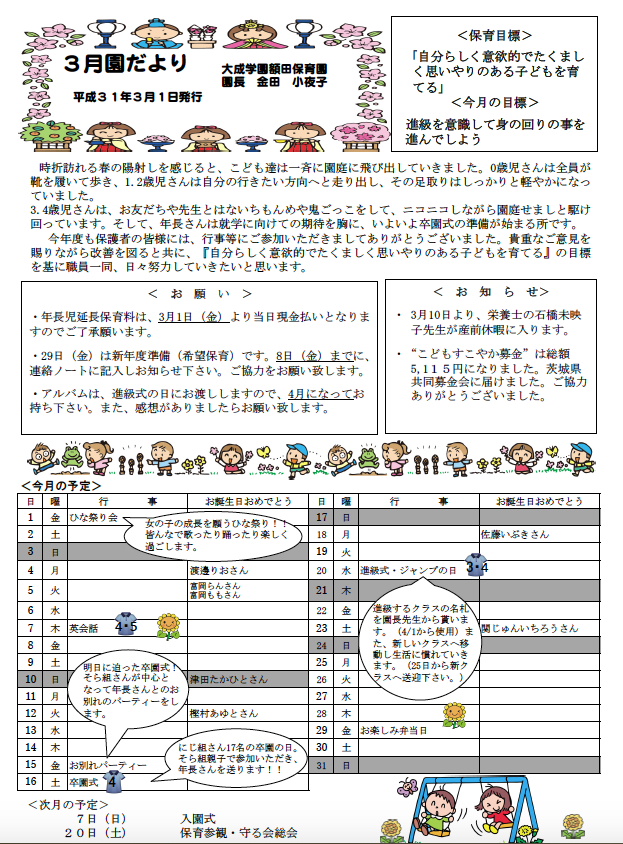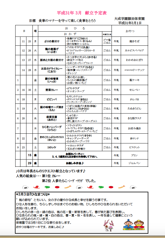 3月の園だより・給食だより 2019 3/01 ニュース ニュース URLをコピーしました! おひなさまづくり(4歳児) 社会体験(にじ組) コメント コメントする コメントをキャンセルコメント ※ 名前 ※ メール ※ サイト 次回のコメントで使用するためブラウザーに自分の名前、メールアドレス、サイトを保存する。 上に表示された文字を入力してください。 Δ