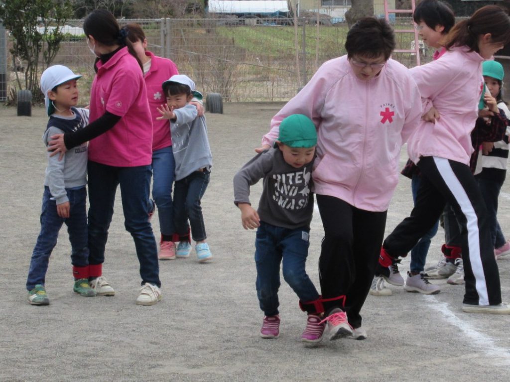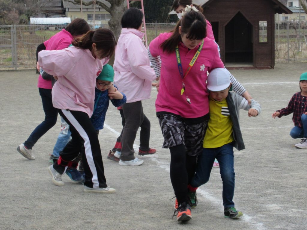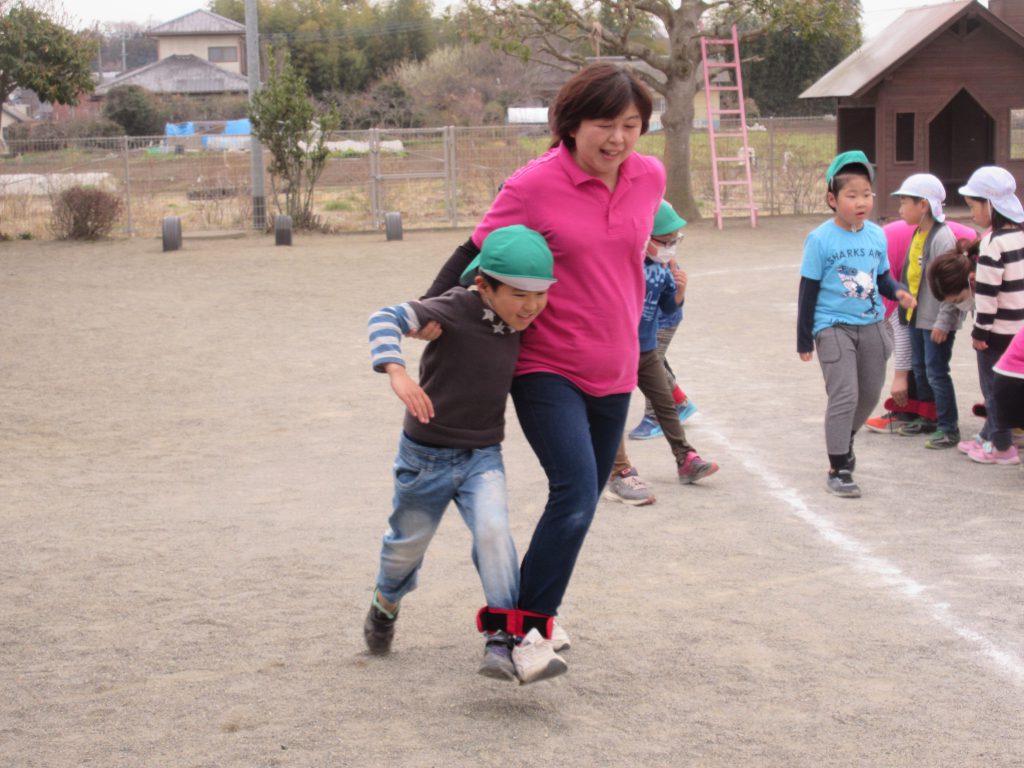 先日卒園式を迎えたにじ組さんからの「もう少しでお別れだから、先生と二人三脚がしたい!」との希望で、保育園の全職員と年長さんで実施しました。運動会の種目で練習を重ねた思い出がよみがえりました。テラスでは、「がんばれー」と応援する子どもたちの声が響きました。全員で最後の思い出を作ることが出来ました。