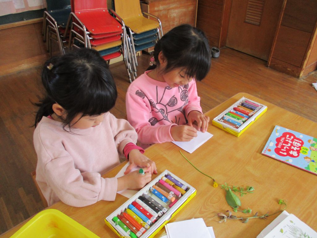 図鑑で草花を調べ、保育園の草花マップづくりをしています。どんな形をしていて、どんな色をしているのか、じーっと観察し、実物そっくりに描こうとしているにじ組さんです。新しい草花を見つけると、「これも調べよう!」と次から次へと発見しマップづくりを楽しんでいるところです。