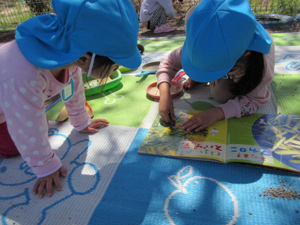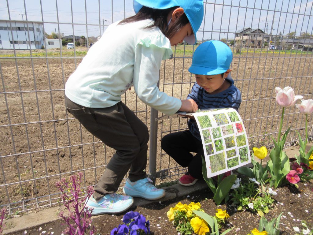 園庭や園舎の裏で春の草花を摘みました。絵本の「野原のレストラン」を見ながら草花を使って お料理しているそら組さんです。また、「この花はこれかな?」「ぴったりだー!!」と花の種類に興味を持ち「この花はこれと一緒かな?」とお友だちと一緒に絵本の中の花とピッタリの花を見つけようとしている姿があります。