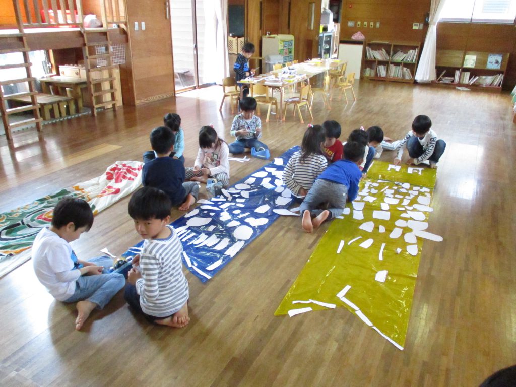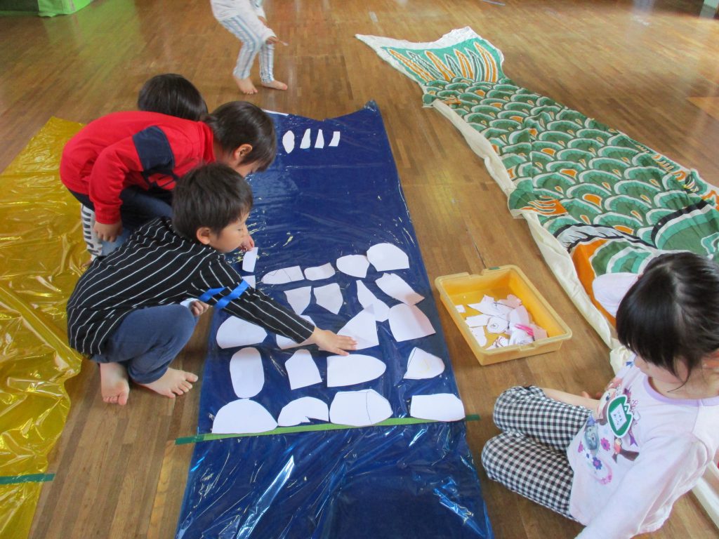 「にじ組こいのぼりをみんなで作ろう!」とこいのぼり製作がはじまりました。本物のこいのぼりをじっくりみながら、「うろこはこんな感じかな?しっぽはこんな形?」と友達と相談しながら進める姿がありました。