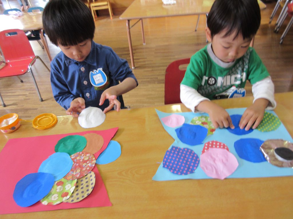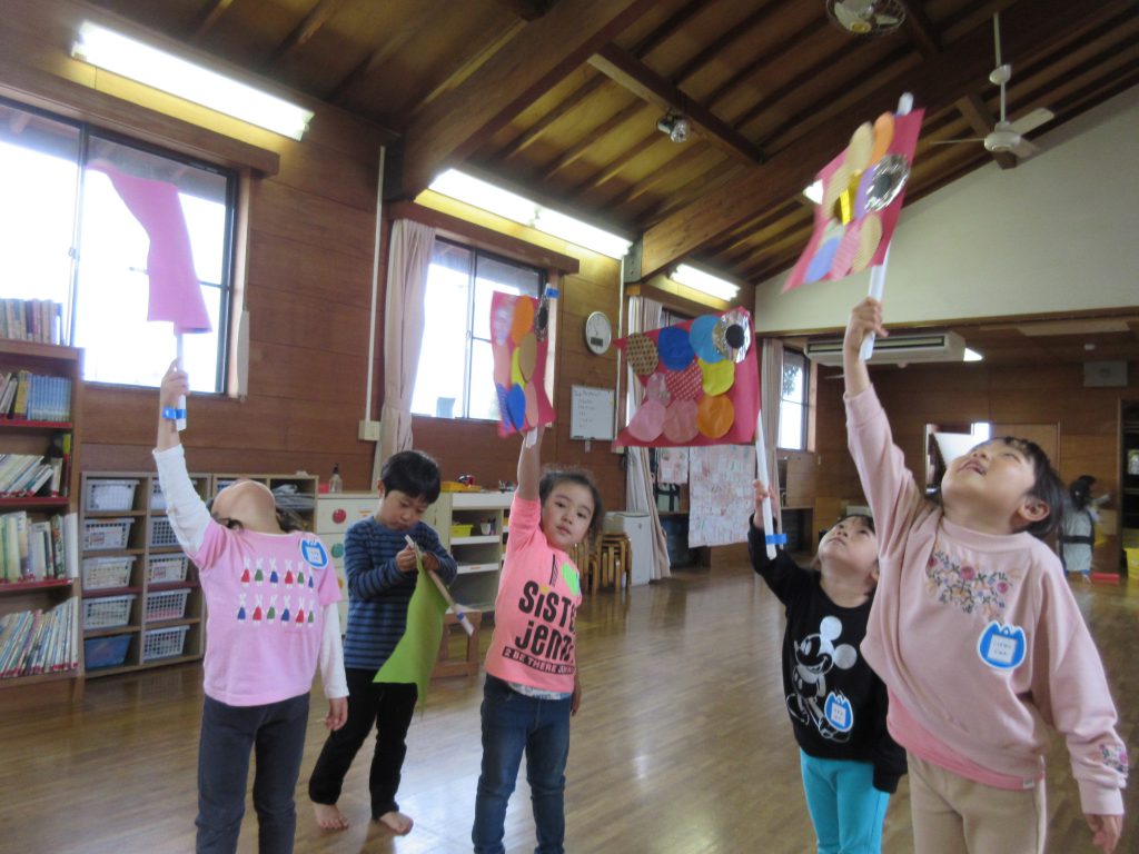 5歳児がホールに飾ってくれたこいのぼりを見て、「いろいろな形や柄があるね。」「そらさんも作りたいな。」と始まったこいのぼり作り。自分のはさみを使って慎重に丸い形を切りました。切ったり貼ったり・・・自分の力で作ったこいのぼり。出来上がりがうれしく、「こいのぼり」の歌を歌いながら見上げている姿がありました。