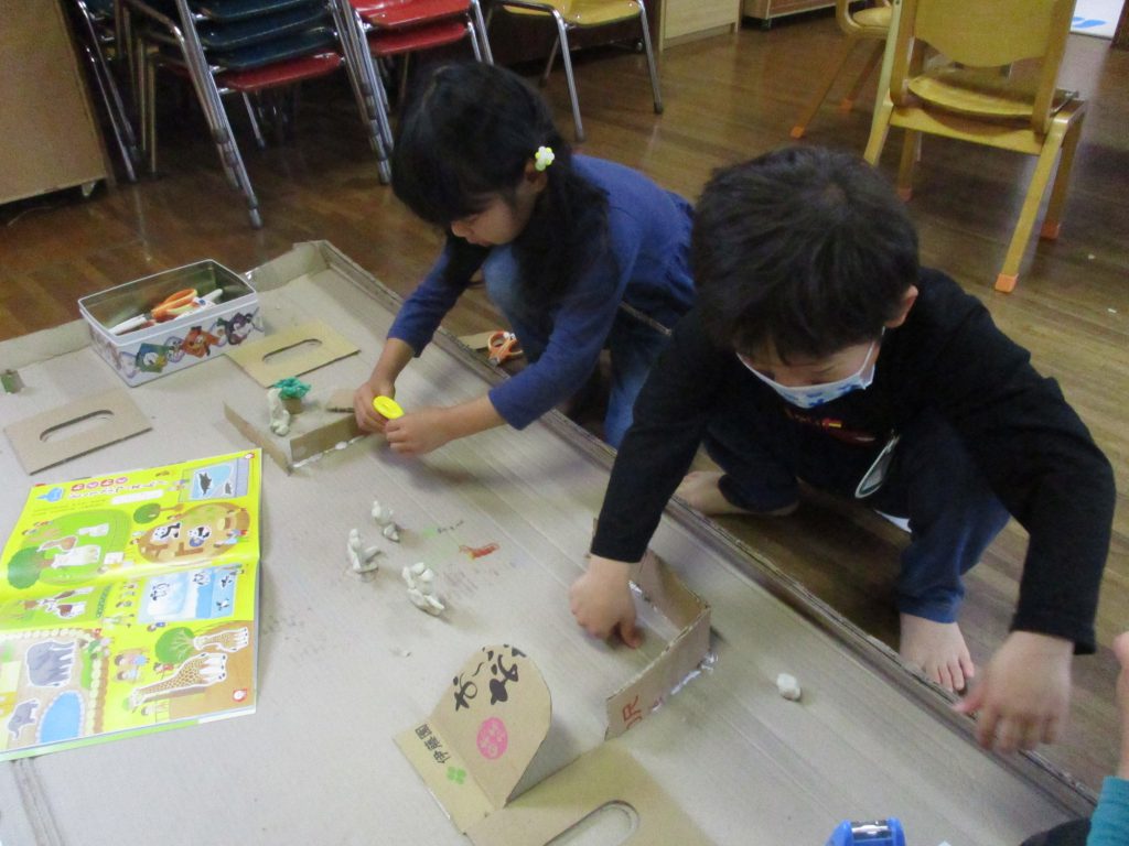 粘土で動物づくりに夢中になっています。「出来上がった動物をどこに置く?」と話し合う子どもたち。「あっ!そうだ、動物園をつくってあげよう!!」と段ボールと画用紙をつかって動物たちの柵や小屋づくりが始まりました。”みんなの動物園”と名付け、「今度はどんな動物をつくろうかな~?」と考えているところです。