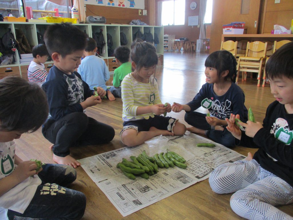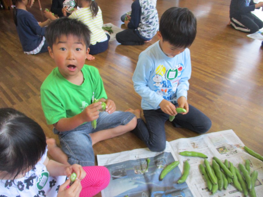 給食の先生に頼まれて、そらまめのさやむきのお手伝いをしました。以前に読んだ絵本”そらまめくんのベット”というお話に気づき、「そらまめの中は本当に雲のようにフワフワなのかなぁ~?」などとつぶやきながら取り掛かりました。さやむきを始めると…「先生!本当だった」「フワフワで気持ちよさそう」と驚きと確信のお手伝いでした。