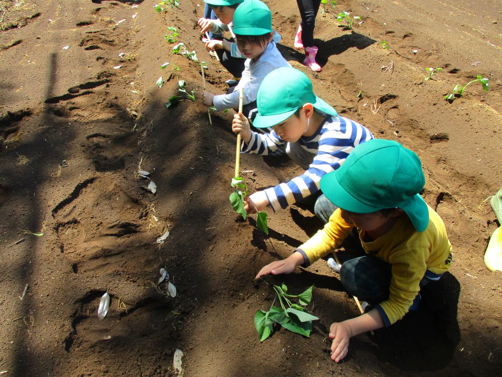芋苗植え(5歳児) 2019 5/27 ニュース 芋苗植えに挑戦!「大きな芋に育てたいときは苗をまっすぐ植える」「たくさん芋を育てたいときには横に植える」と植え方で育ちが違うことを教えてもらい、「僕はたくさん食べたいから横!」「大きいお芋にしたいからまっすぐ」と考えながら植えていました。 ニュース URLをコピーしました! 散歩(4歳児) もうすぐ動物園へ!!(3歳児) コメント コメントする コメントをキャンセルコメント ※ 名前 ※ メール ※ サイト 次回のコメントで使用するためブラウザーに自分の名前、メールアドレス、サイトを保存する。 上に表示された文字を入力してください。 Δ