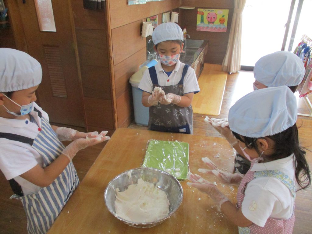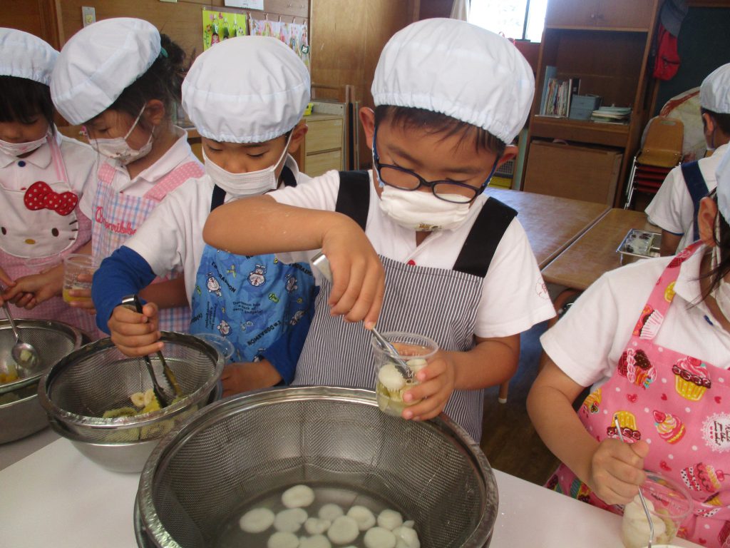 白玉あんみつ作りをしました。1回目のクッキングの時よりも準備が早く、白玉を丸めるのも上手になりました。今回は白玉あんみつのトッピングにも挑戦!「白玉は4つ、バナナとキウイは1つカップにいれてね」と言うと、「1.2.3…」と数をかぞえながら、慎重にいれるにじ組さんでした。