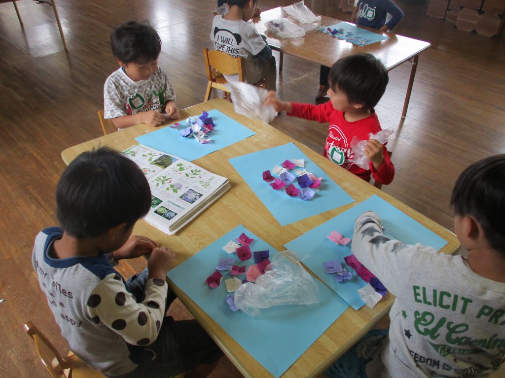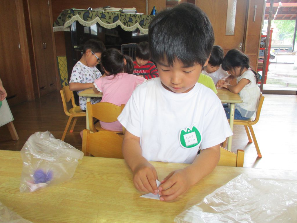 折り紙でアジサイの製作しています。四分の一の小さい折り紙を使っての製作。はじめは「難しい、次どうやるんだっけ?」などという姿がありましたが、だんだんとコツをつかみ、指先を器用に使いながら、作る姿がみられました。また、にじ組になって初めてのパーティーです。パーティー準備も着々と進んでいるところです。