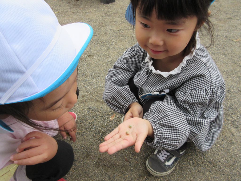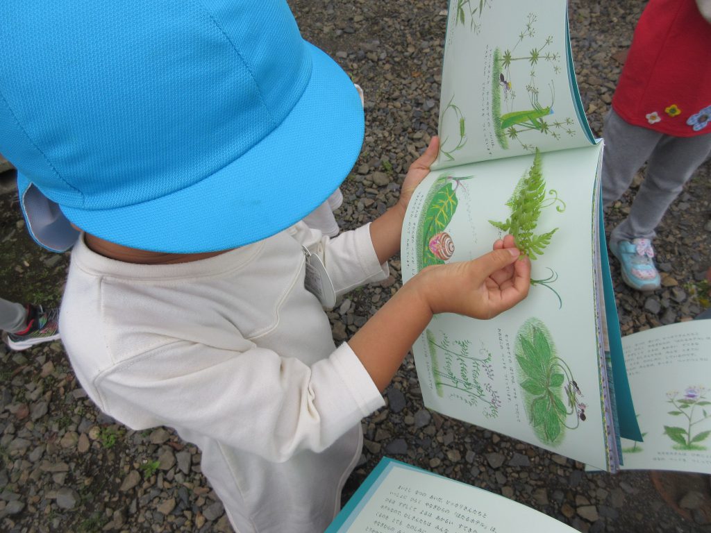 6月の月刊絵本「ほたるホテル」を見て虫に興味が高まってきました。「シダの葉っぱのベッドには何がねているかな?」と様々な葉を見ていくと葉っぱのベッドの中にはカタツムリやダンゴムシ…「ダンゴムシ発見!!」「かたつむり発見!!」と色々な虫を見つけ友達と一緒に観たり、絵本と照らし合わせたりしています。