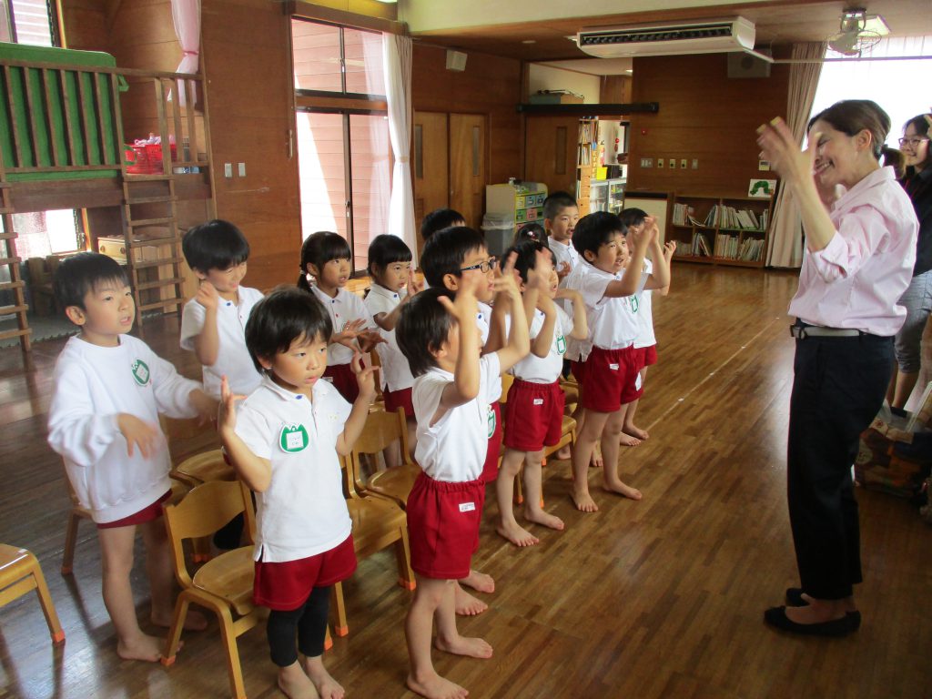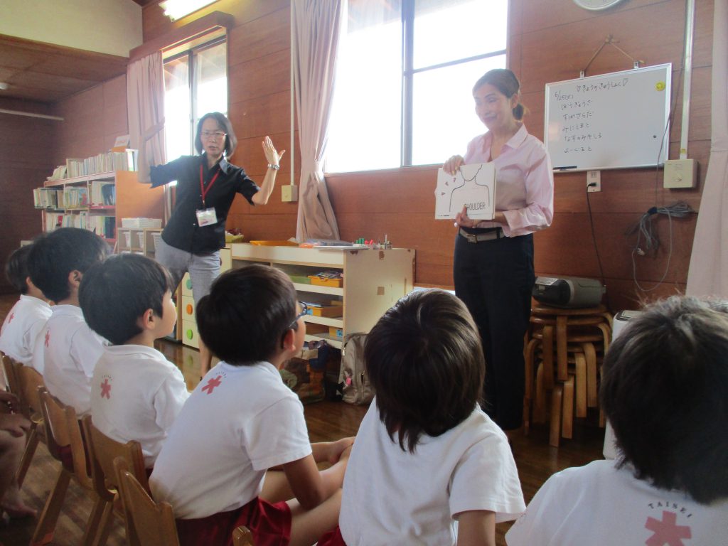 今日の英会話では、キラキラ星を英語で歌ったり、頭・手・肩など、体の部位の言葉(単語)を教えてもらいました。