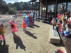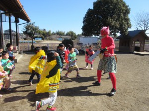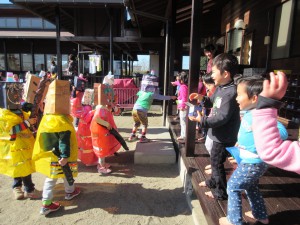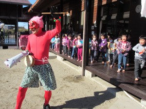 子どもたちは、小さな鬼に驚きながらも「おにはそとー!!」と鬼退治することができました。