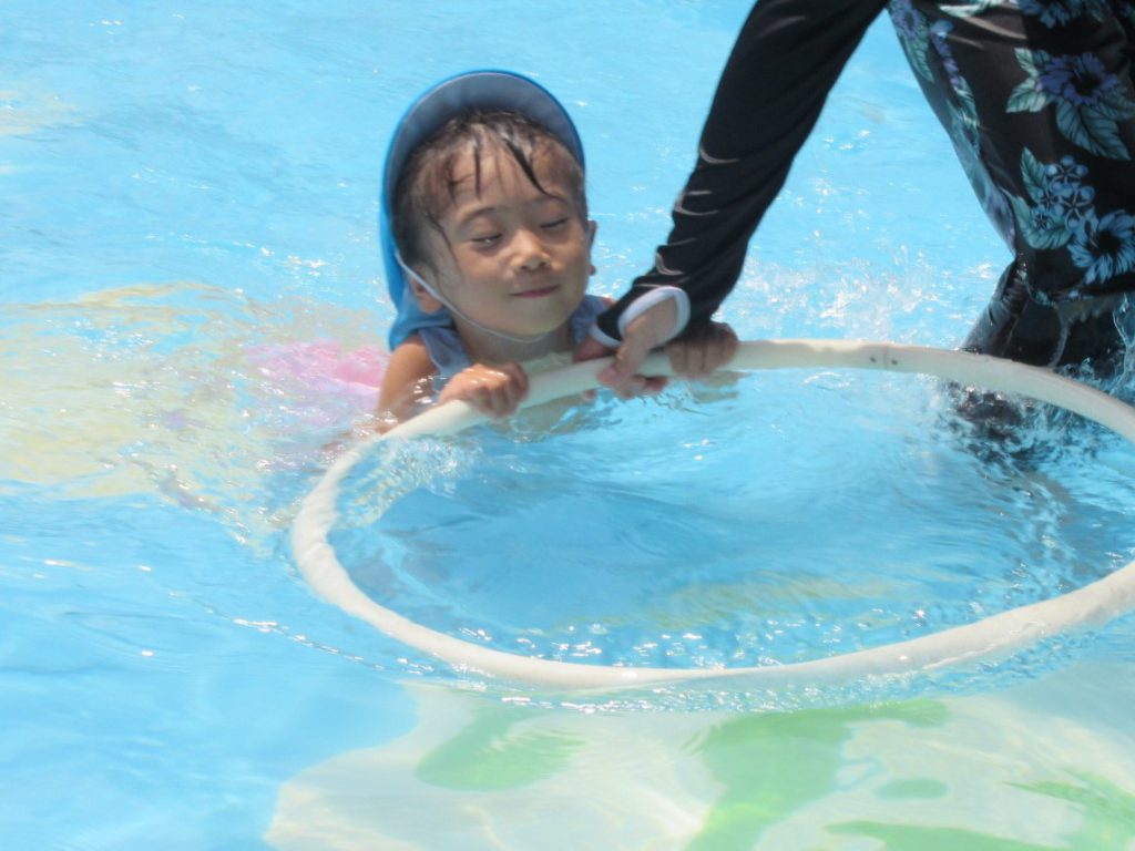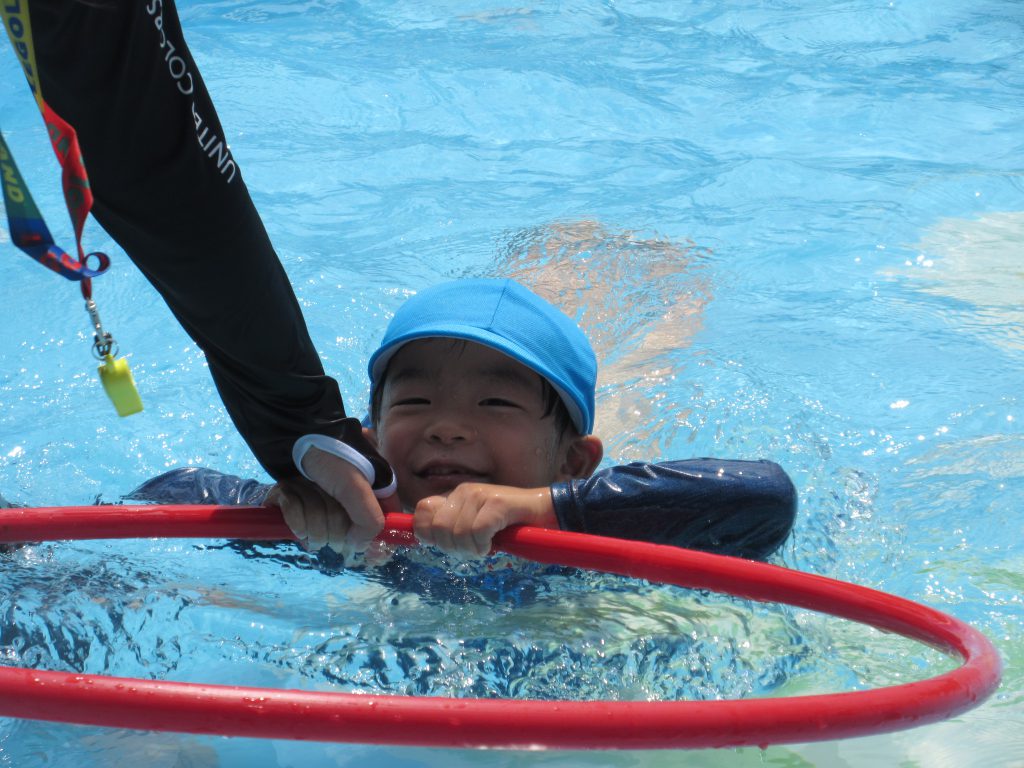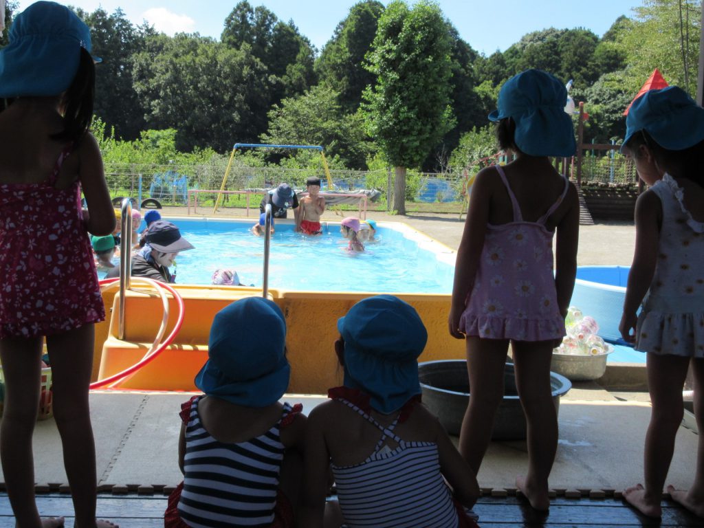 毎日水着に着替えるとテラスから見える年長さんのプール活動の取り組みに、自然と「がんばれー!」の声援や拍手をして応援する姿があります。「年長さんってすごいね。」と年長さんへの憧れの気持ちが膨らみ、そら組さんも大きなプールでワニやラッコなど動物の模倣泳ぎをしています。年長さんのまねっこ泳ぎでフープにつかまって蹴伸び練習や顔付けも「やってみたい」と意欲的に取り組んでいます。