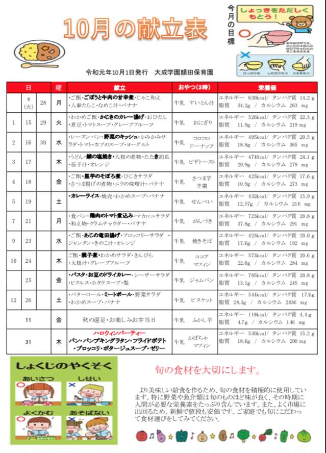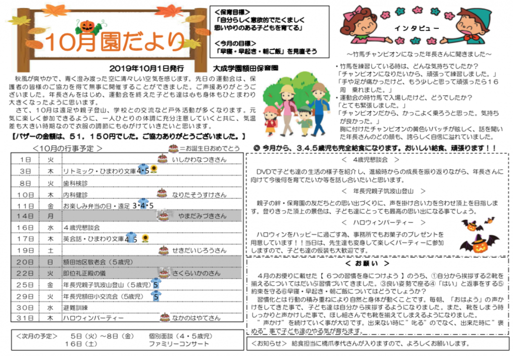 10月の園だより・給食だより 2019 10/01 ニュース ニュース URLをコピーしました! お楽しみお弁当日(4歳児) 稲刈り(5歳児) コメント コメントする コメントをキャンセルコメント ※ 名前 ※ メール ※ サイト 次回のコメントで使用するためブラウザーに自分の名前、メールアドレス、サイトを保存する。 上に表示された文字を入力してください。 Δ