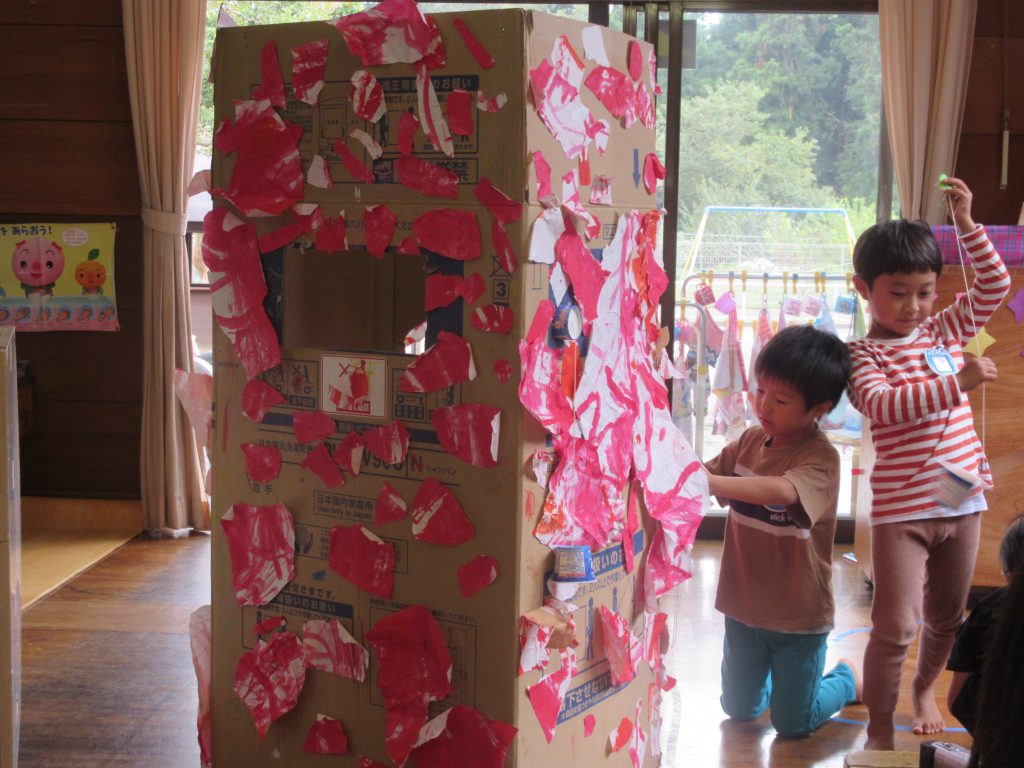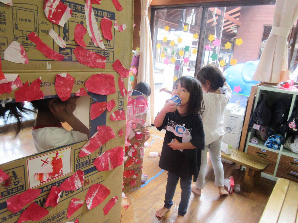 絵本「11ぴきのねことへんなねこ」の中の宇宙船を作ろうと始まったそら組。昨日完成した宇宙船に「糸電話をつけたら面白そう」と糸電話をつけたり、魚釣りのシーンを再現しようと魚を作り遊びを広げています。