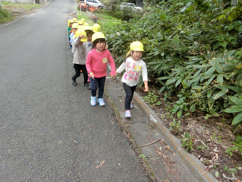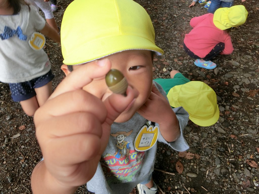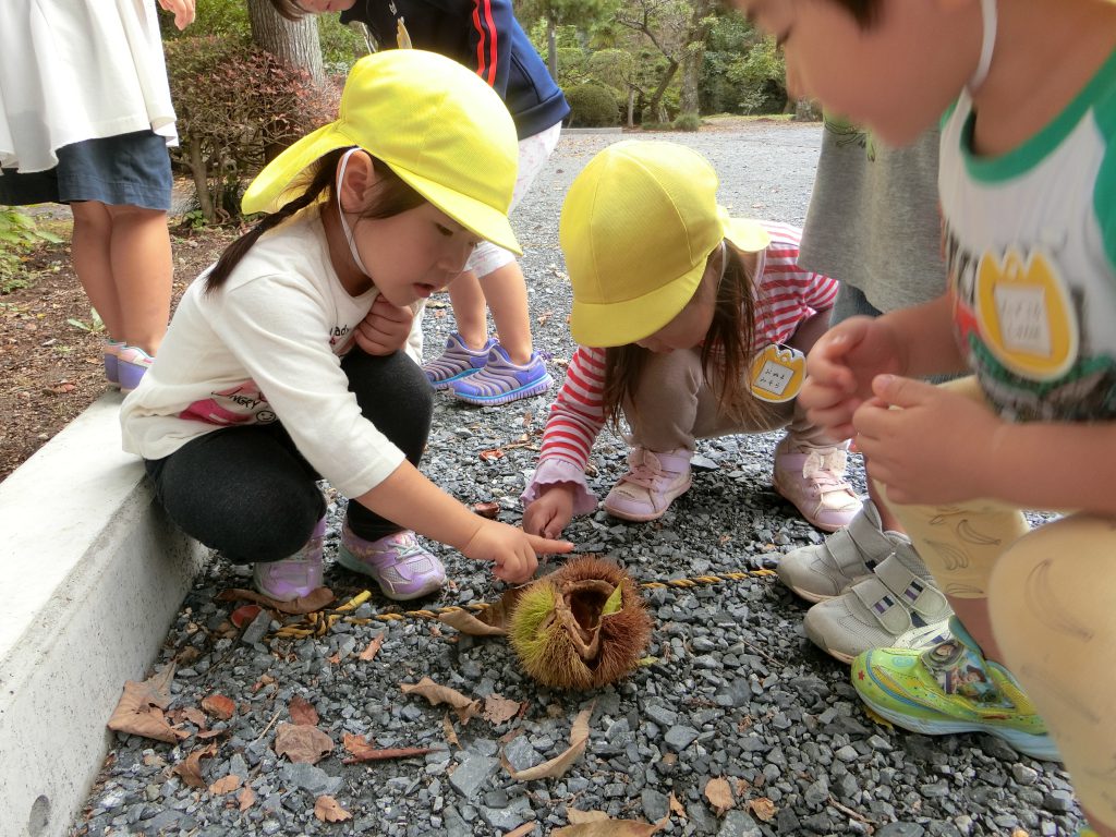絵本でどんぐりを見て、拾いに行きたい!と、楽しみしていた散歩に出発!!「みどりのどんぐりあった~」「栗のからチクチクする~」と触れたり、興味津々な姿が見られました。もうすぐ遠足!!今日の散歩のように上手に歩き公園でも「どんぐり」探しを楽しみにしています。