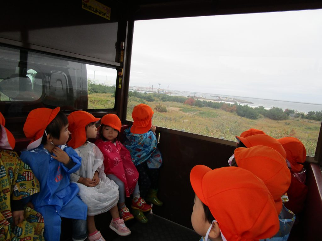 「今日、遠足いく?」「バスきた?」と出発する前からワクワク・・バスに乗りいざ保育園を出発!!海浜公園に到着し、トレインを見つけると「これに乗るの?」ととってもうれしそうでした。”ポー♪”と出発の音が鳴り走り始めると「動いた!」「楽しいね!!」と笑顔いっぱい。少し肌寒かったのでレインコートを着ての乗車です。