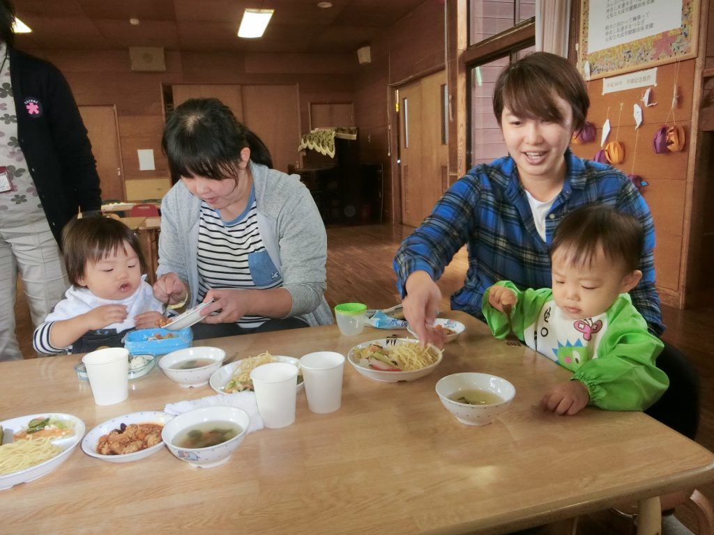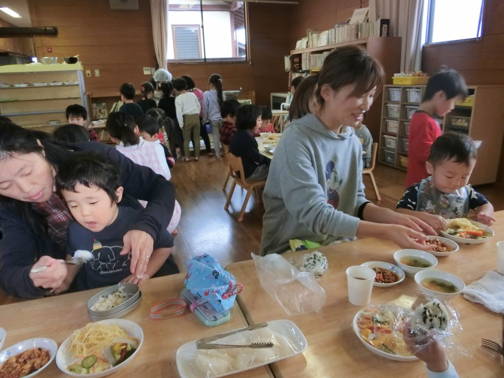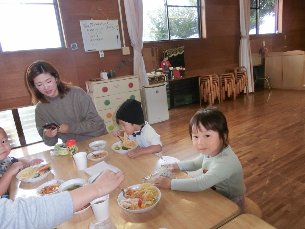 今日のメニューは、パスタ、お豆のドライカレー、シーザーサラダ、ピクルス、ホタテのスープ、梨でした。初めての給食に手をたたいてワクワクしたり、何から食べようか迷ったりと、それぞれでしたが、最後は笑顔で完食!「ごちそうさまでした。」「おいしかったね。」と、お母さんと顔を見合わせる姿がありました。