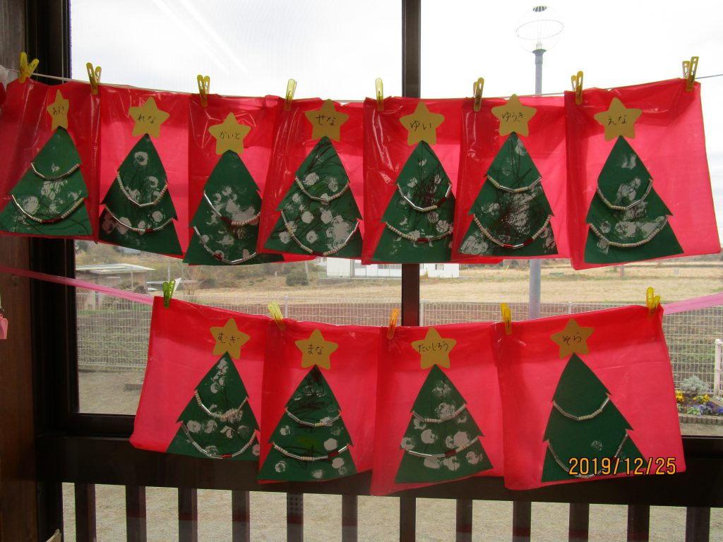 毎日、サンタさんの登場する絵本を見てサンタさんの来る日を待っていました。園庭にサンタさんを探しに行ったり、空を見て欲しいものを大きな声でお願いしたり・・・。上手になったひも通しやクレヨンを使って飾りを作ったり・・・。
