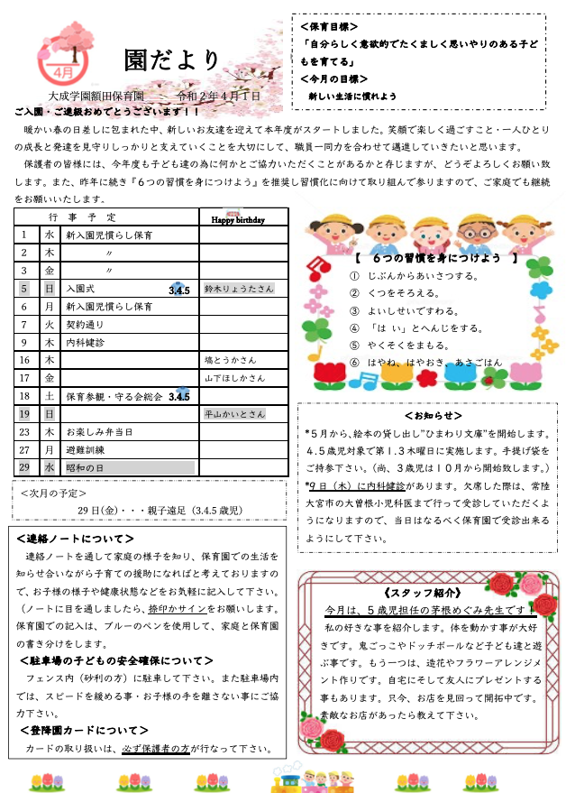 4月の園だより・給食だより 2020 4/03 ニュース ニュース URLをコピーしました! 散歩(4.5歳児) 進級したクラスで(5.4.3歳児) コメント コメントする コメントをキャンセルコメント ※ 名前 ※ メール ※ サイト 次回のコメントで使用するためブラウザーに自分の名前、メールアドレス、サイトを保存する。 上に表示された文字を入力してください。 Δ