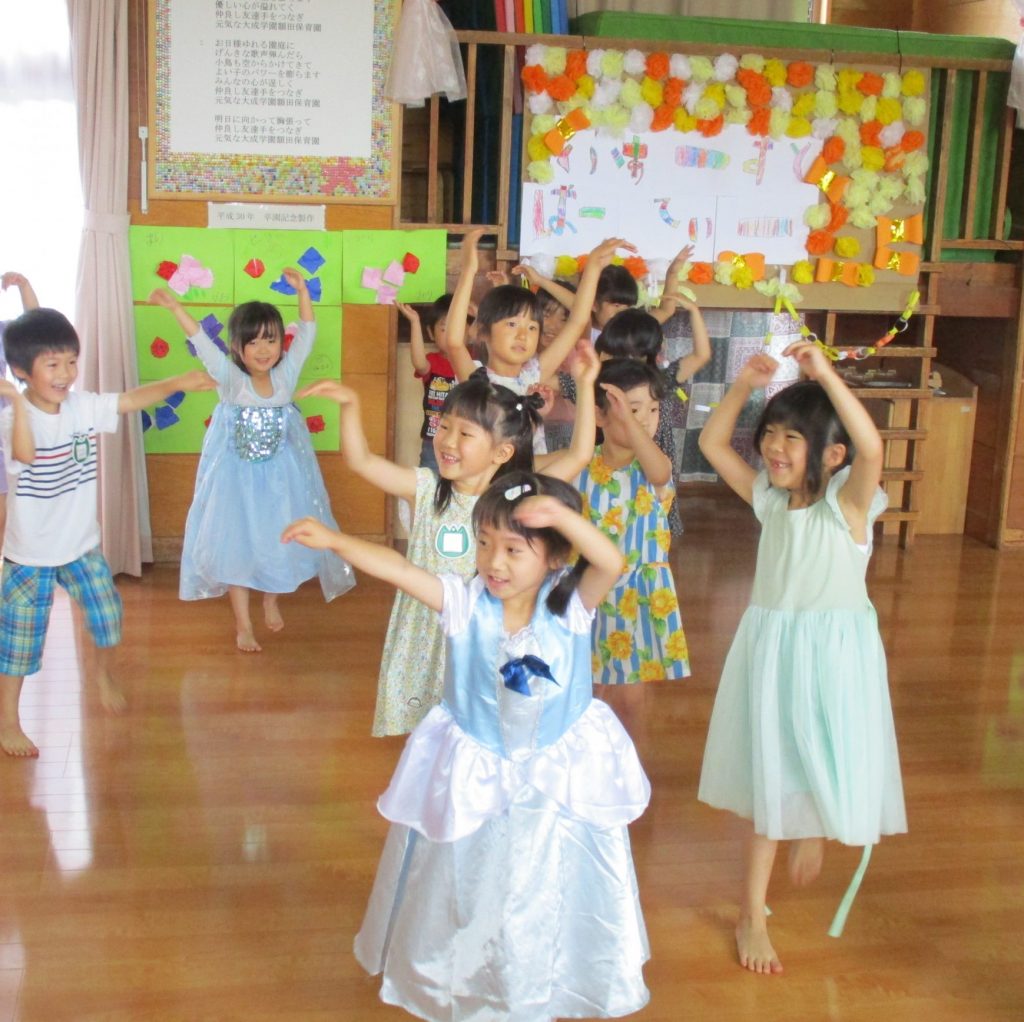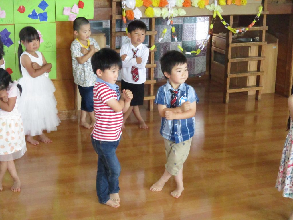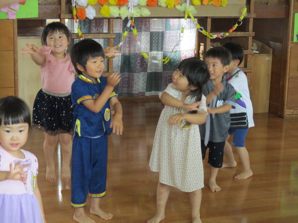 初めてのパーティー!5歳児は準備の時から、「パーティーが楽しみだね」と期待を持ちながら会場の飾り付けをしていました。4歳児は「このダンス、パーティーでしたい!」という希望通り、元気な声をあげながら踊ってくれました。3歳児はお兄さんお姉さんと一緒の初めてのパーティー。スタートはドキドキの様子でしたが、大好きなダンスを踊るときにはノリノリでかわいいダンゴムシに変身!笑顔あふれる楽しいパーティーとなりました。