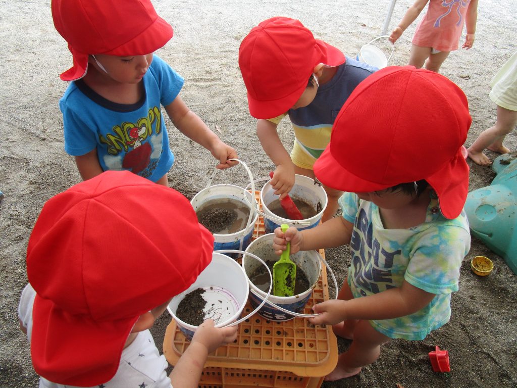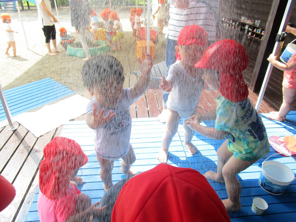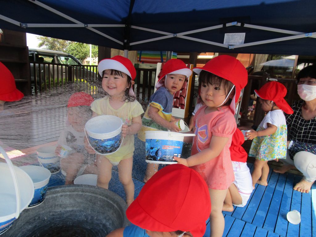 「おみず、やろうね」の声にウキウキ大喜びな子どもたち。