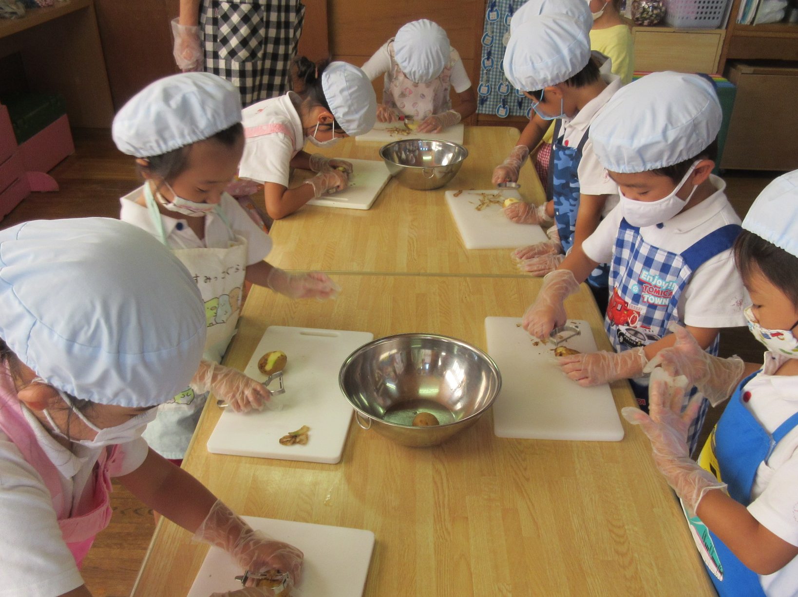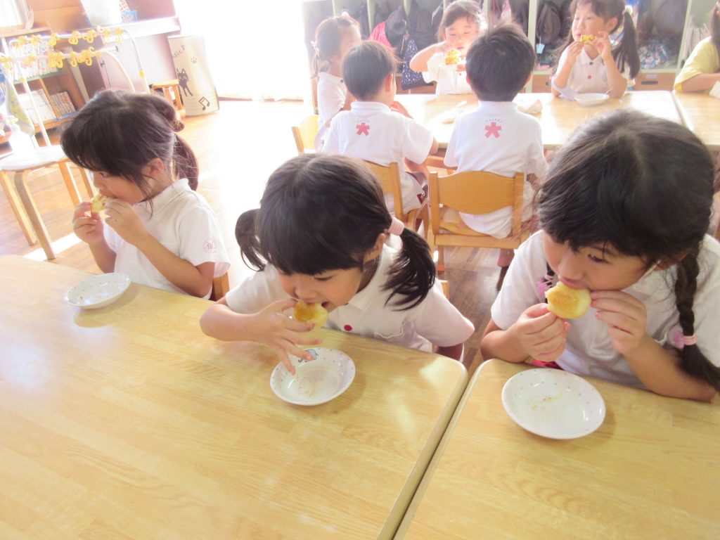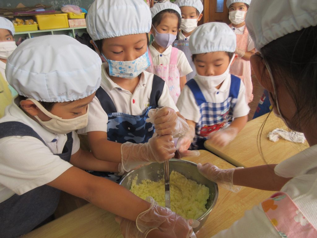 保育園の畑で収穫したジャガイモを使って『ポテト餅』作りしました。初めてのクッキングにドキドキ・ソワソワ・・・。エプロンを身につけると「よし!準備できた!!」と張り切る姿がありました。皮むきはとても丁寧にでき、初めての包丁では「猫の手・・・こんな感じ?」と手元を良くみながら慎重に切ってました。感想を聞くと「1、2・・5」と数を数えながらマッシャーで潰す作業が一番力が入ったそうです。自分で作ったおやつを「すごくおいしい!」「また作りたいな」とうれしそうに食べていました。次のクッキングが楽しみな様子です。