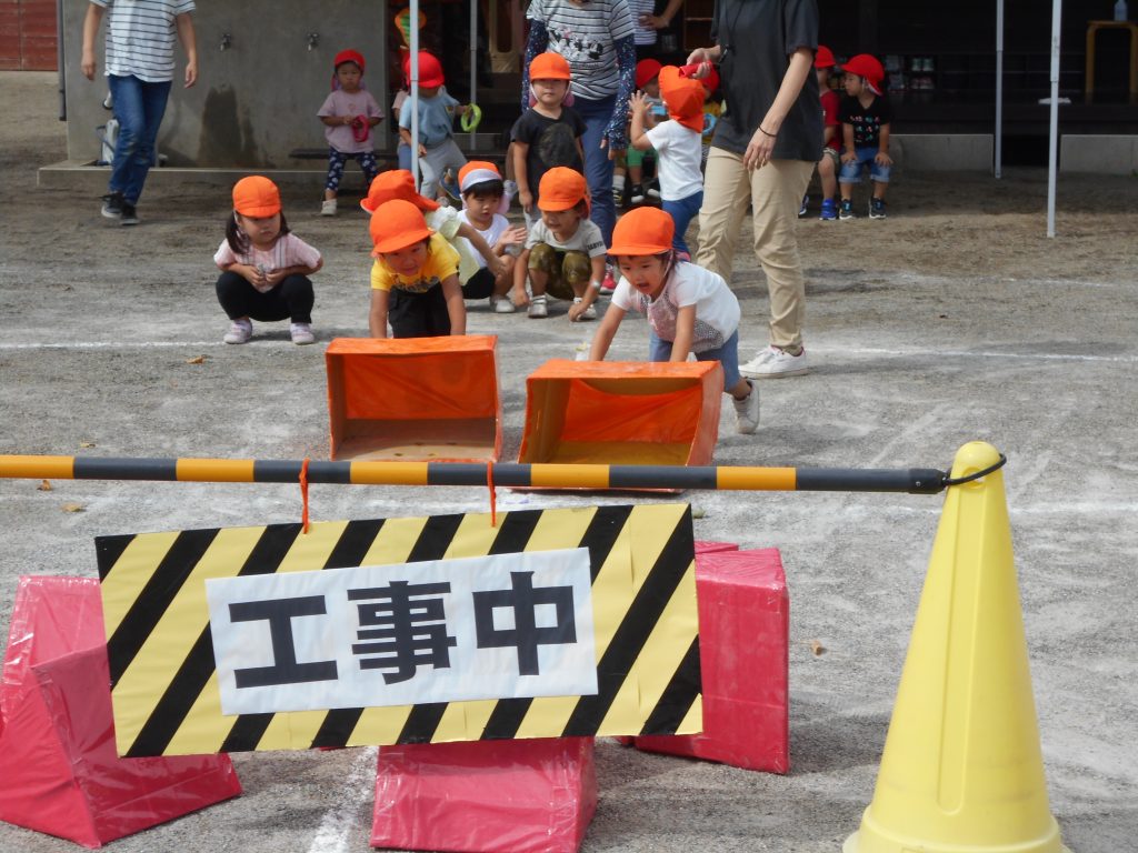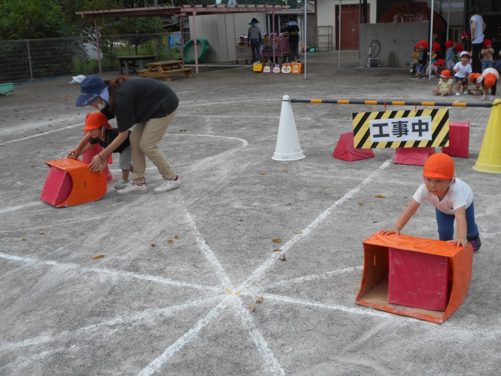 「はたらくくるま」が大好きな子どもたち。今日は額田保育園をリフォームすることにしました。ブルドーザーを押して出発です!!