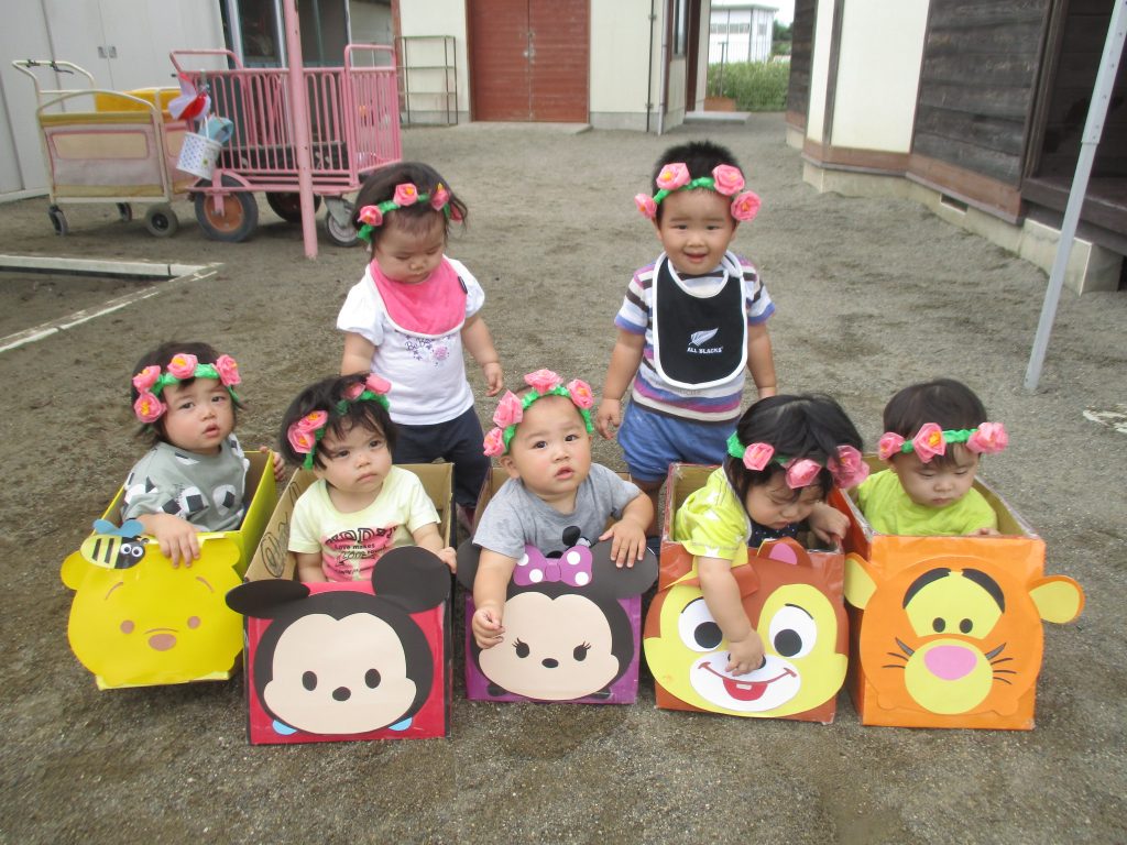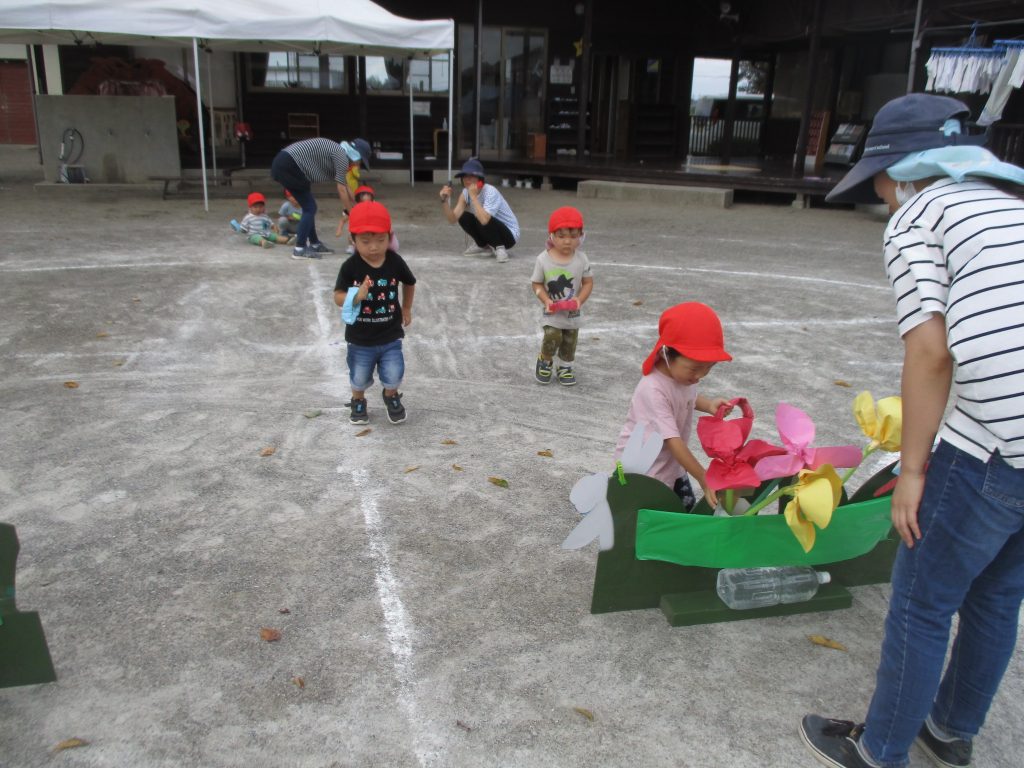 1歳児はすてきな保育園にお花を届けます♡ハンドルをもって運転中♪