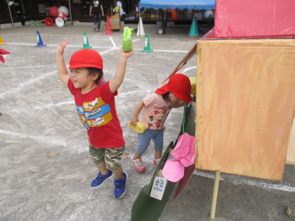 保育園の屋根を乗せて運びます。元気いっぱいの2歳児。重い荷物だってどんどん運びます。
