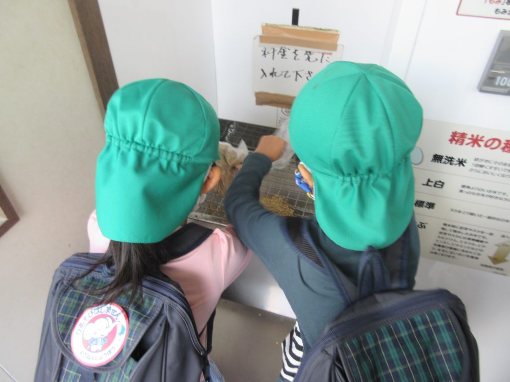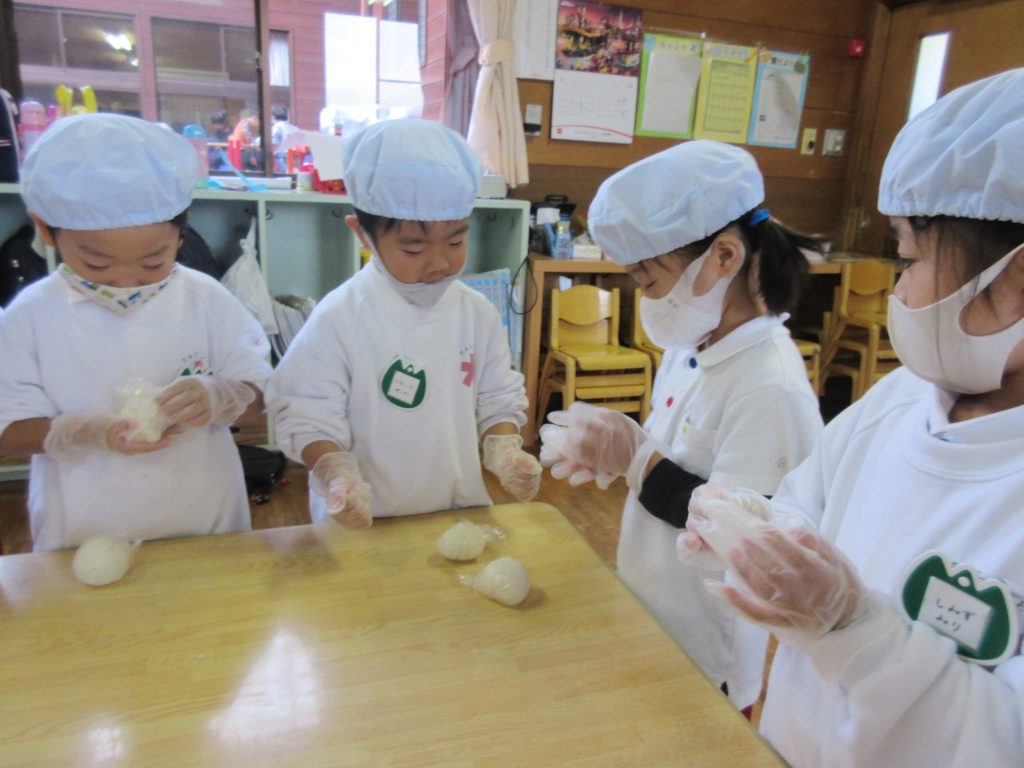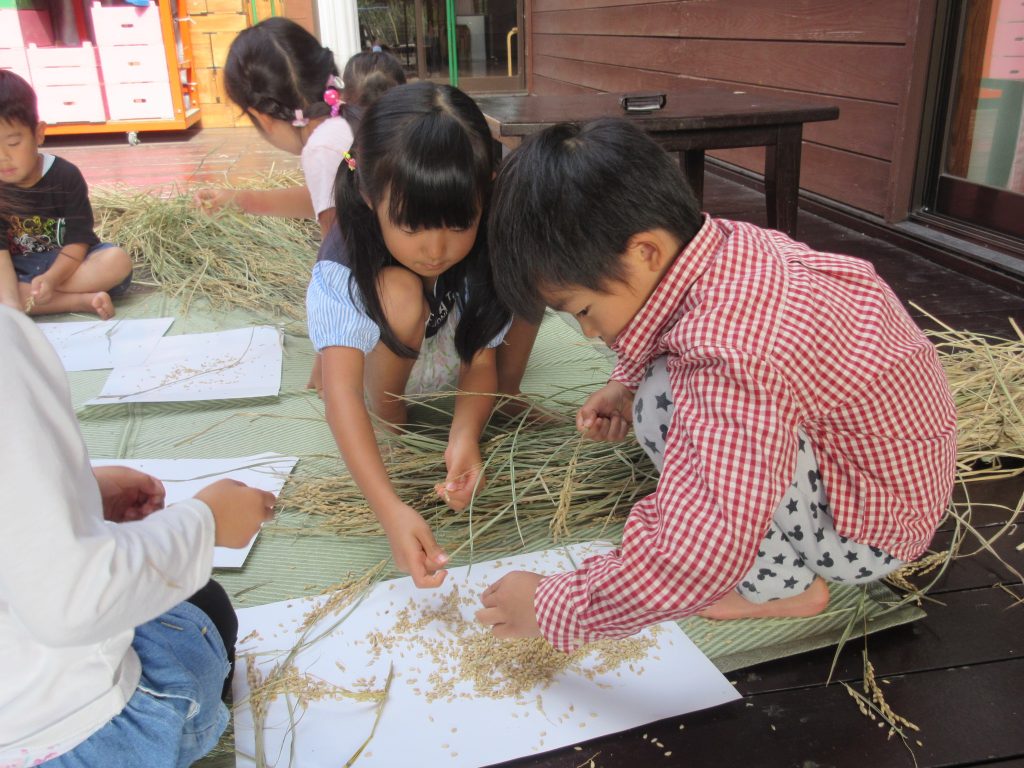 自分で育てたお米が出来上がり、脱穀を自分の手で行いました。「お米を作り人は大変だね。」「疲れるお仕事だね。」と言いながら脱穀作業をし、精米してきました。そのお米を使っておにぎり作り。