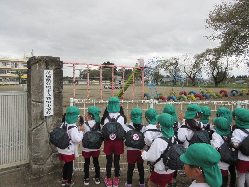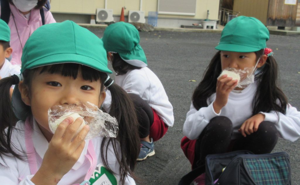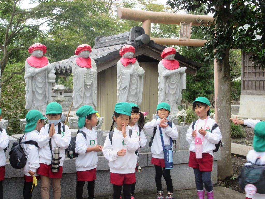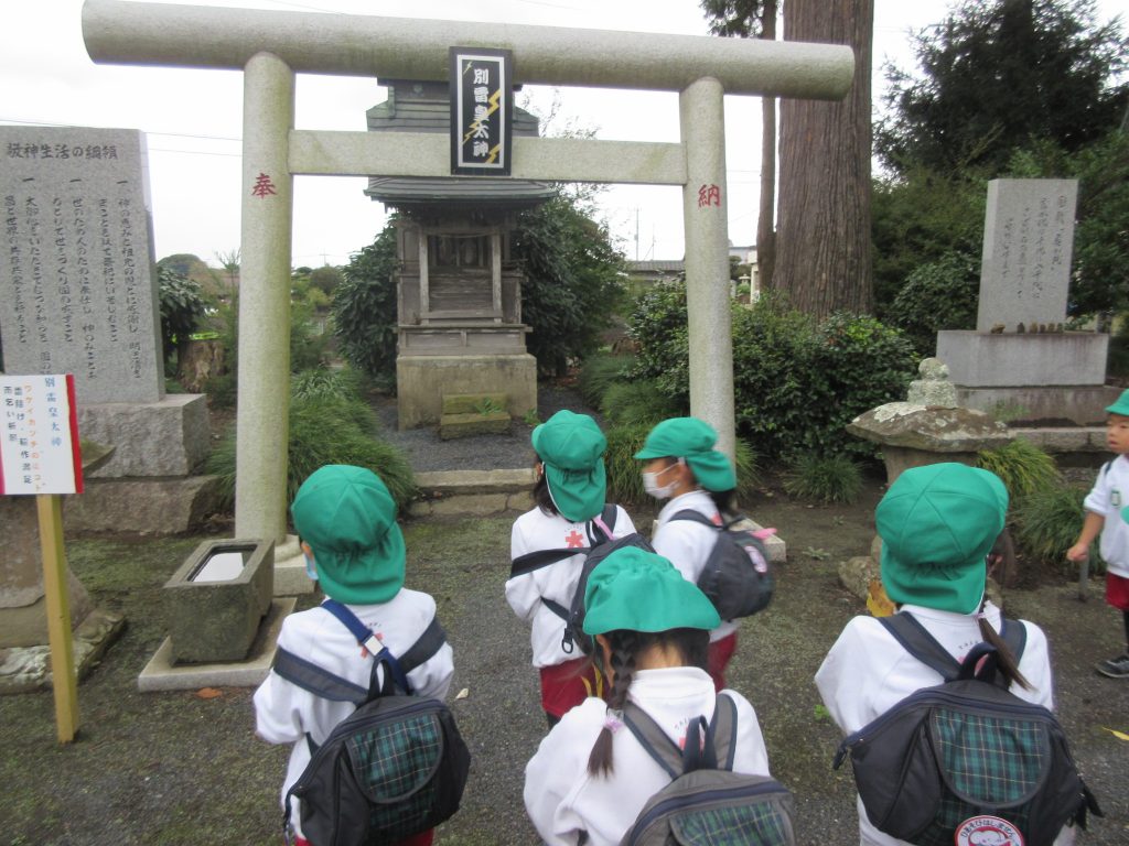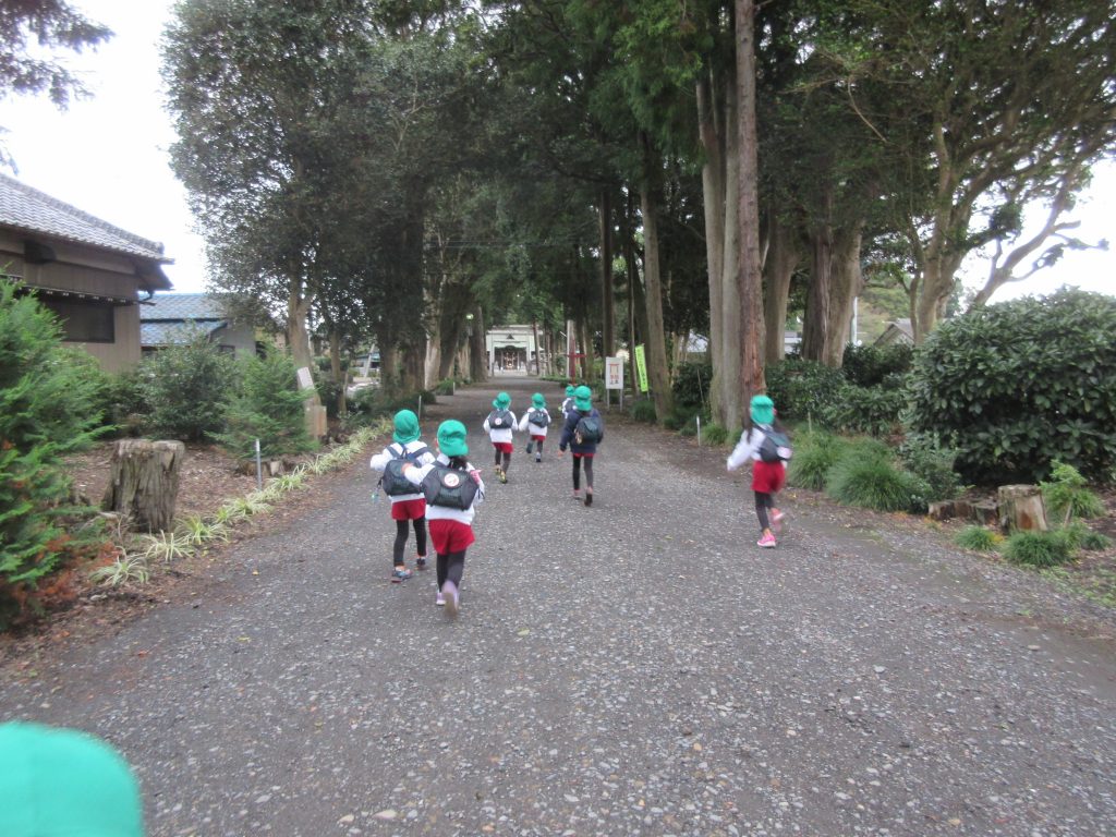 自分で作ったおにぎりを持ち、お散歩へ遠足へ・・・額田神社方面へ行きました。途中小学校を通ると、運動会の練習をする小学生に興味津々なにじ組さん。小学校の運動場の広さにも驚いてました。神社までの道には秋の自然物がいっぱい!!知っている植物の他に、見たことのない植物も採取し、園に持ち帰ってくると図鑑で調べていました。額田神社に行くと雷マークの鳥居を発見。「雷、雨除け」の願をかけてきました。おかげで雨が降る前には園に帰ってくることができました。お散歩遠足で楽しかったこと、驚いたこと、発見などおうちに帰ったらたくさんの土産話があることと思います。
