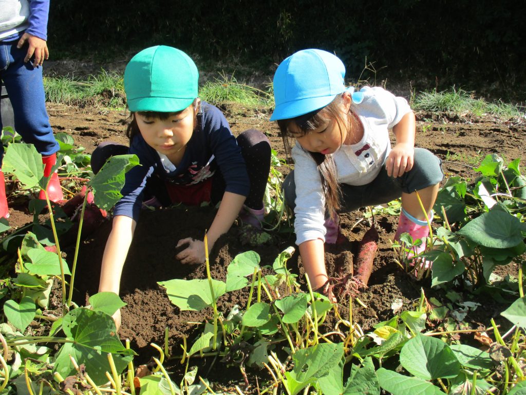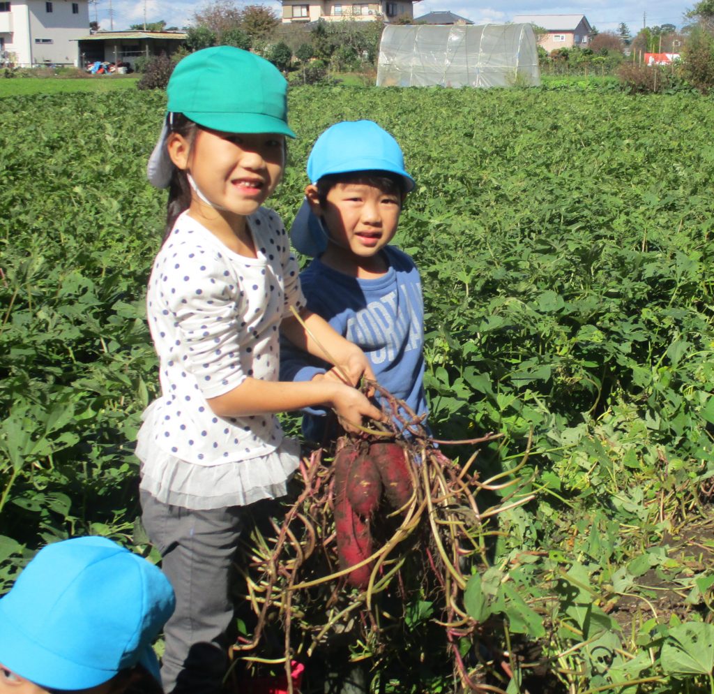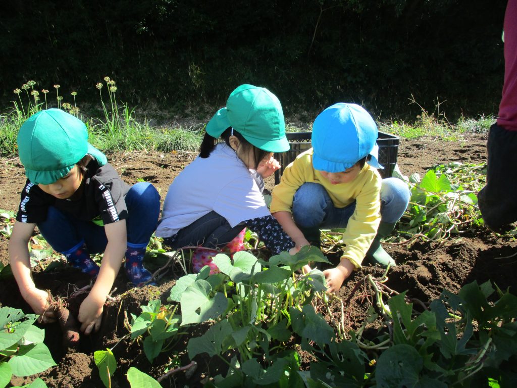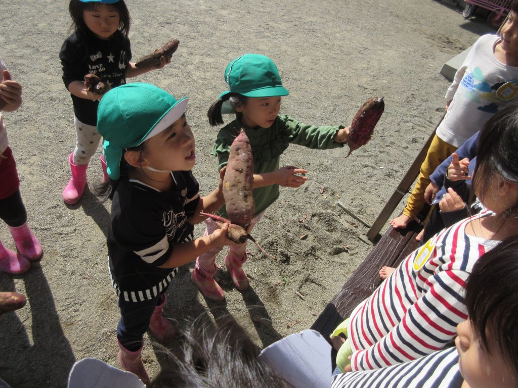 6月の苗植えからずっと畑の様子を気にしていた5歳児。この日を楽しみにしていた4歳児と一緒に芋掘りへ行きました。「シャベルカーのように・・・」と手を真っ黒にしながらたくさんの芋を掘りました。「おうちに帰ってから何にして食べようかな??」と楽しみにしている子どもたちです。