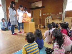 学生(表現文化学科)との交流会 2016 5/10 ニュース 今日は茨城女子短期大学の学生(表現文化学科)の方たちがいらっしゃいました。2、3、4、5、歳児のクラスの子供たちへ大型絵本の読み聞かせや、ハンドベルの演奏や手遊びををしてくれました。子供たちも絵本をじっと見入って、とても楽しんでいました。 ニュース URLをコピーしました! 散歩花見(5歳児) 田植え(5歳児) コメント コメントする コメントをキャンセルコメント ※ 名前 ※ メール ※ サイト 次回のコメントで使用するためブラウザーに自分の名前、メールアドレス、サイトを保存する。 上に表示された文字を入力してください。 Δ