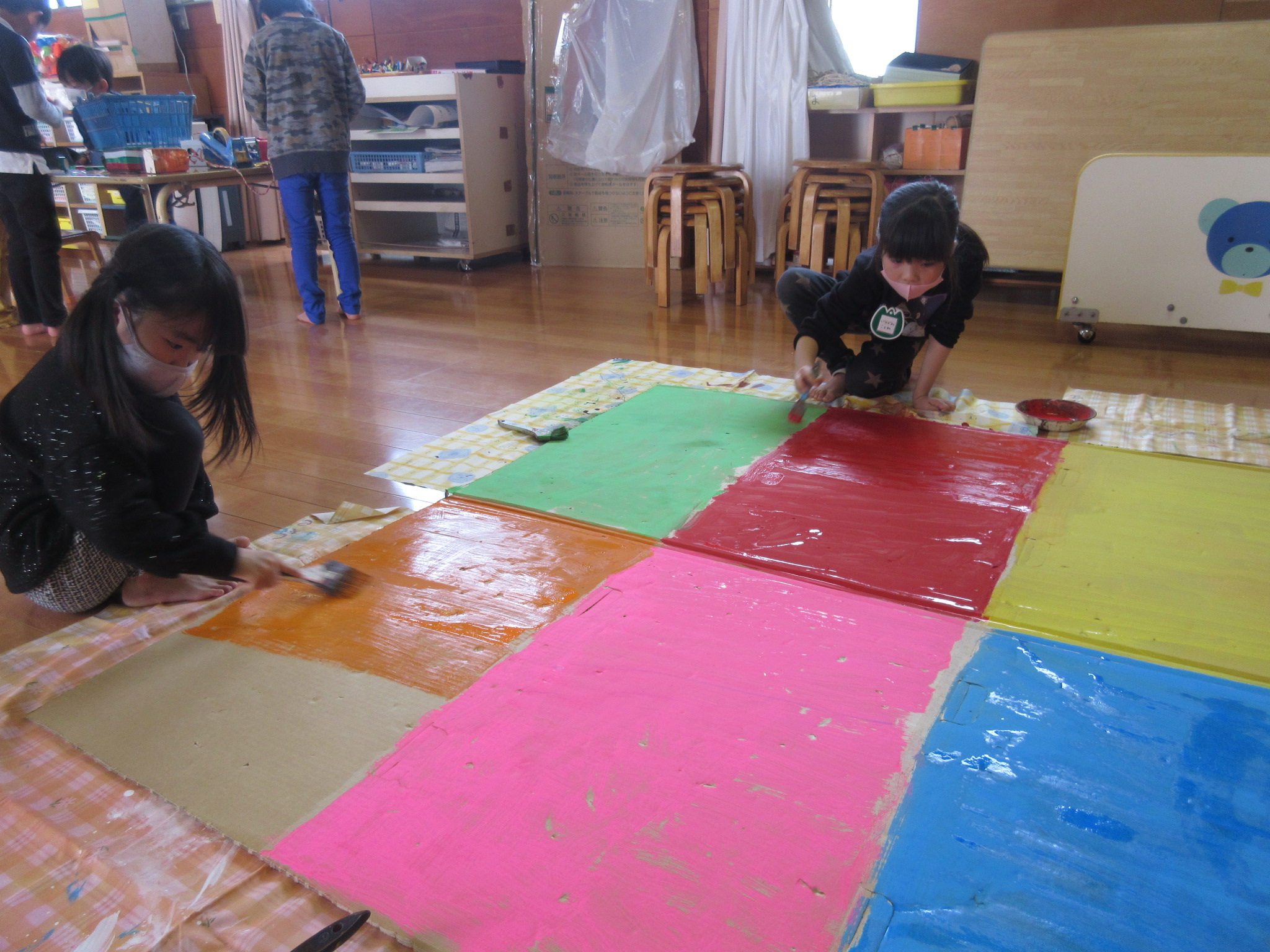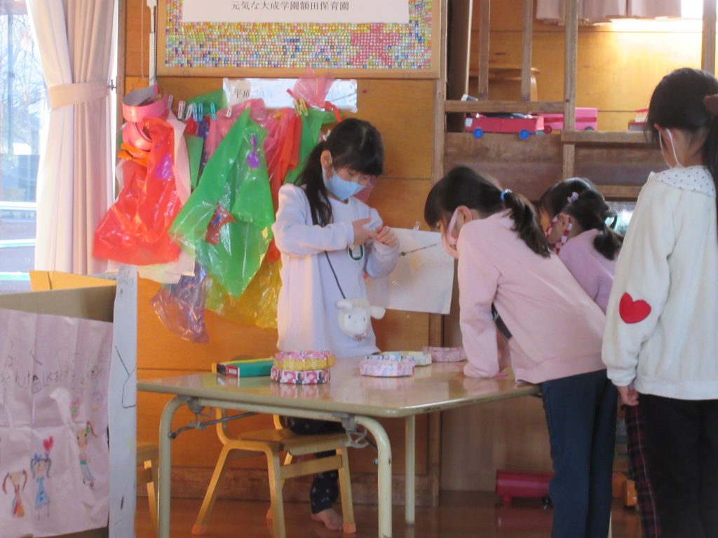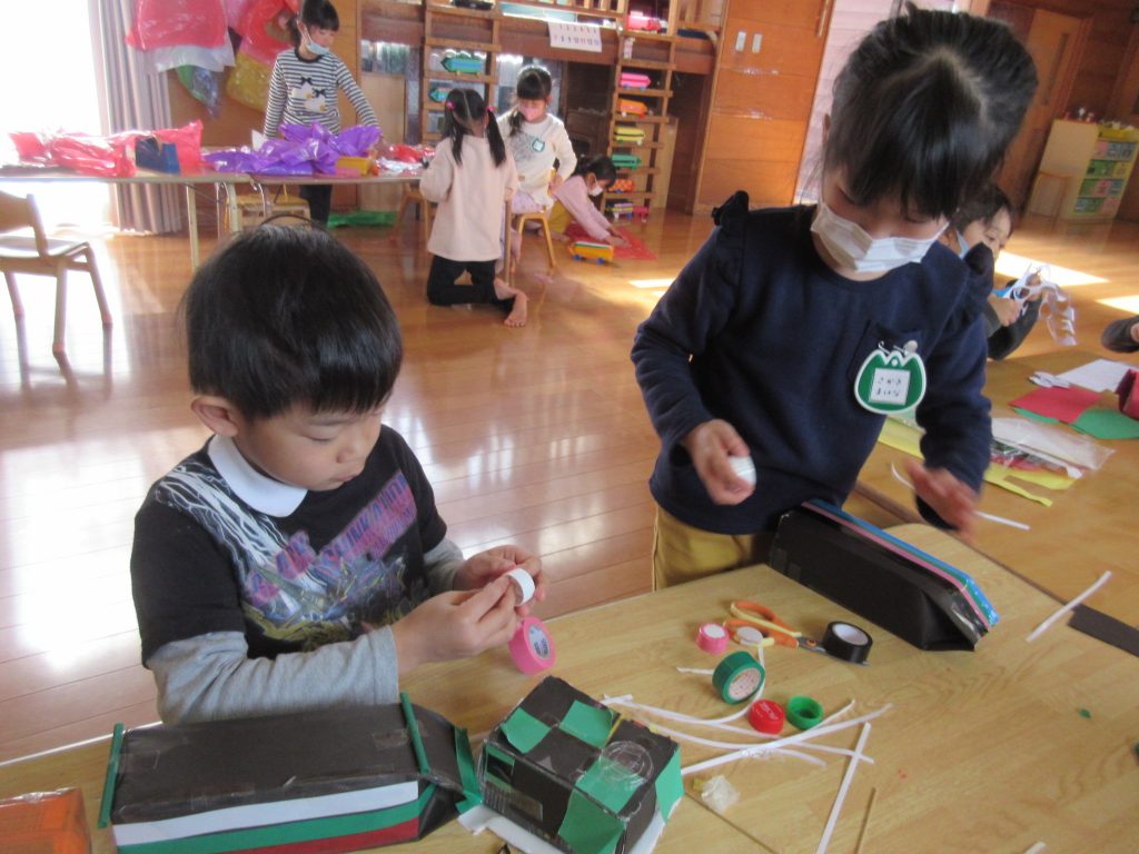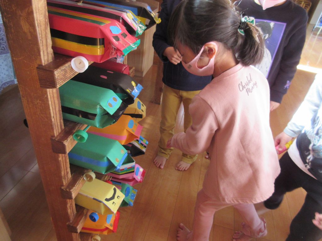 先月から「どんなお店屋さんにしようかな?」と友だちと考えたり、少人数のグループに「私は看板作るから、これよろしくね」と役割を決め進めていました。そして今週からクラスでお店屋さんごっこを展開中です。廃材で車のおもちゃを作り「おもちゃ屋さん」、洋服やアクセサリーを作り「これも素敵ですよ」と販売したりと楽しんでいます。 金曜日には4歳、3歳の小さなお客さんが来るので、楽しみにしているにじ組さんです。