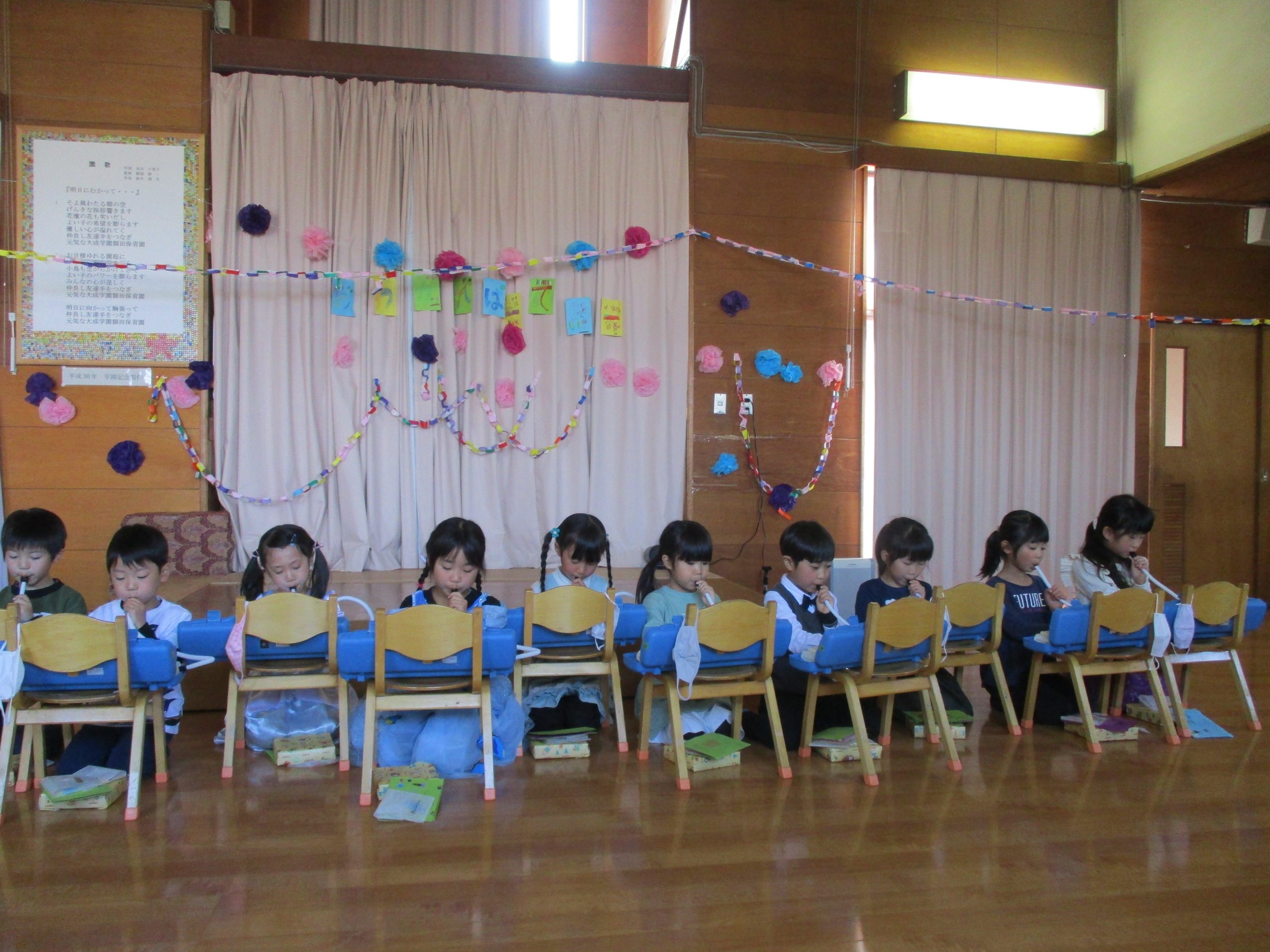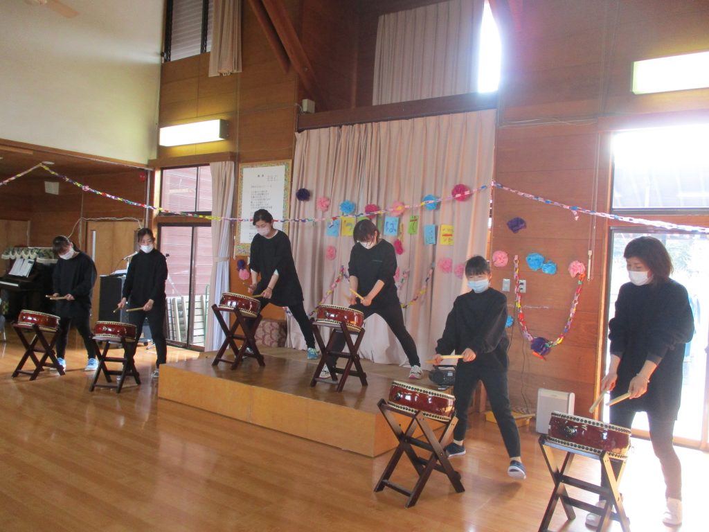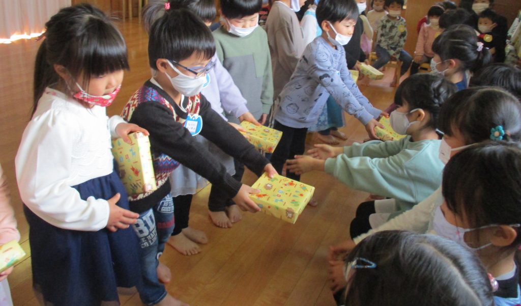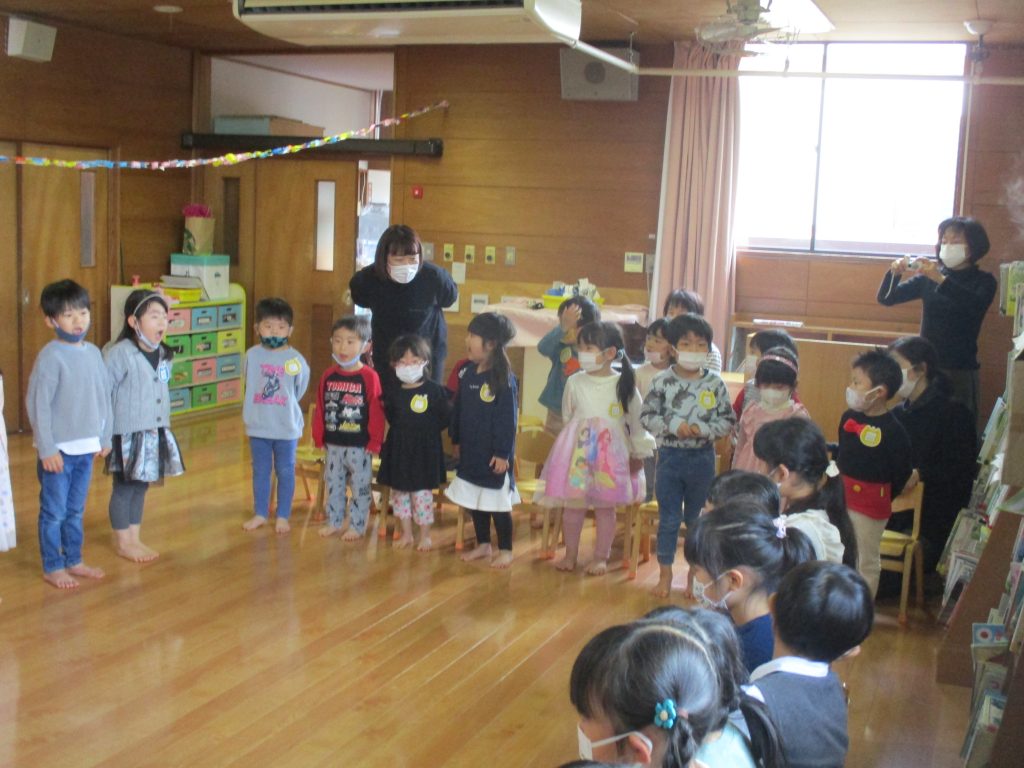 今日は年長さんとのお別れパーティーがありました。つきさん(3歳児)が折紙、そらさん(4歳児)が花紙を使って飾り付けをし、華やかにパーティーがスタート!!まずはじめは、先生たちがソーラン節の曲に合わせて、力強い太鼓の演奏をプレゼント。そら、つきさんからは歌のプレゼント、そして年長さん一人一人にそらさんから素敵なプレゼントを渡していました。年長さんからも、歌・メロディオンとみんなにプレゼントがあり、お互いに感謝を伝え合うパーティーとなりました。
