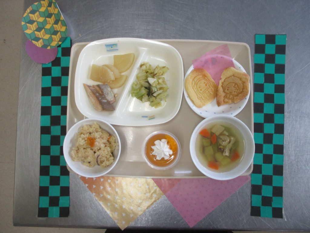 鬼滅のキャラの好きな料理を献立にしました。「この料理はこのキャラクターが好きなんだよ」と楽しい会話が出来ました。おやつには、鬼滅を型どったクッキーです。周りから食べはじめ、本体にはなかなか進めない子もいました。