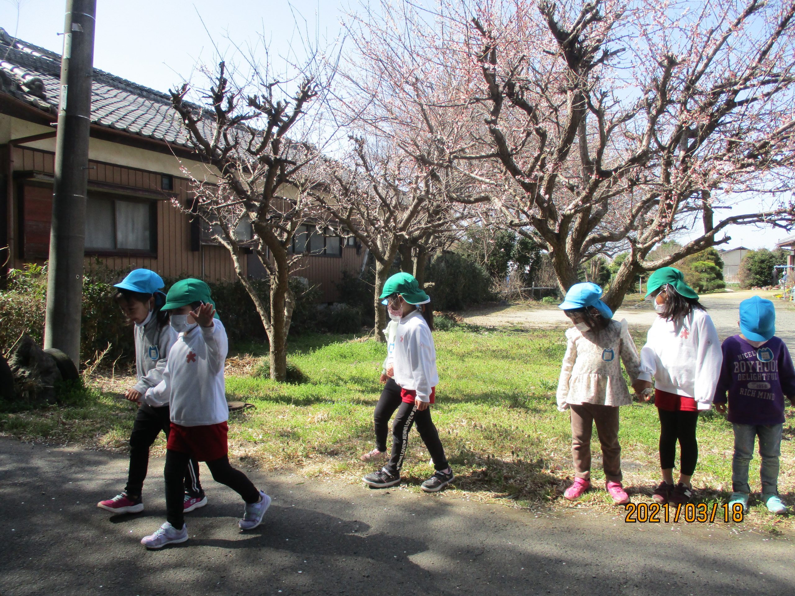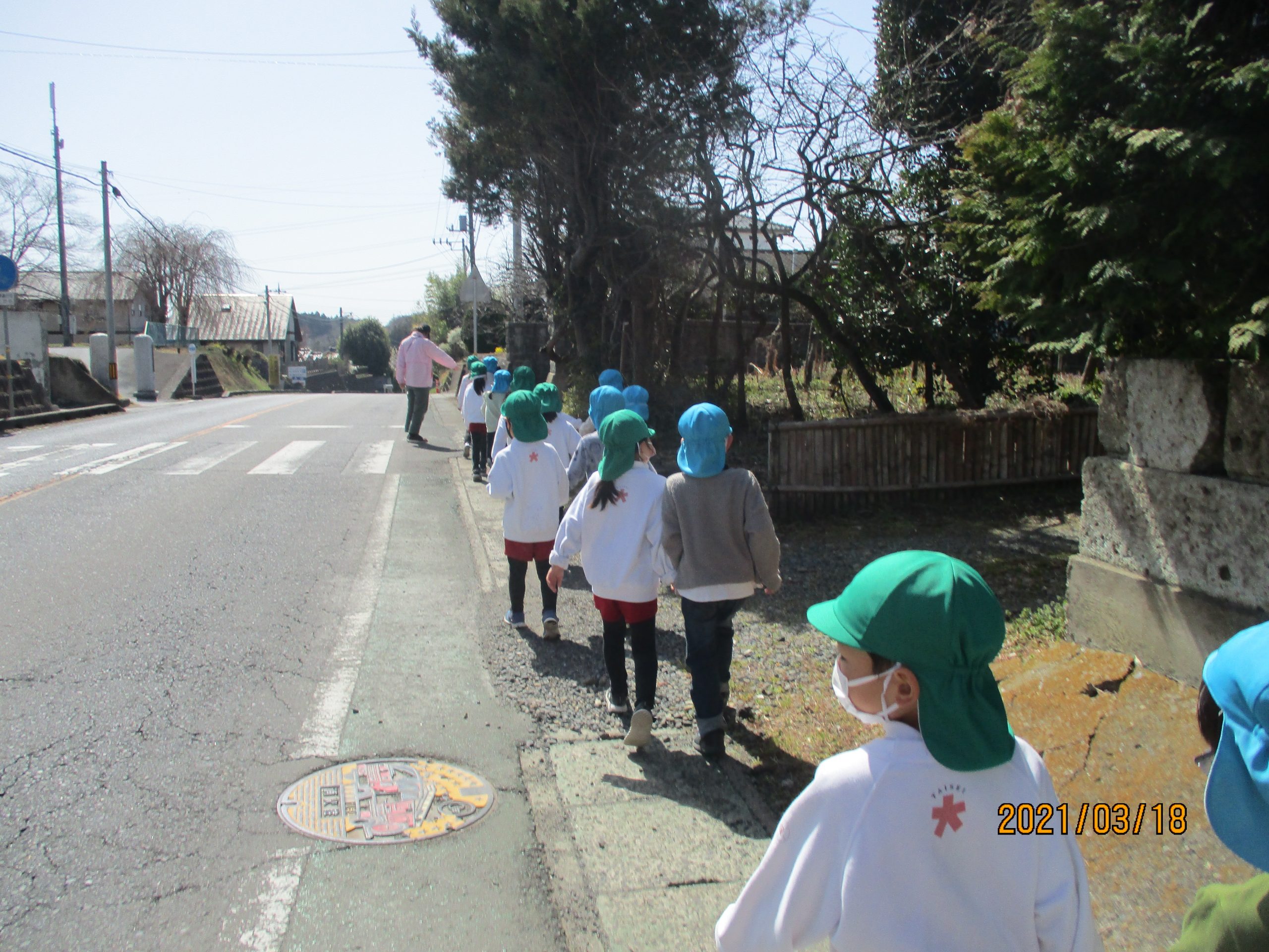 今日はそら組が、卒園児と一緒に散歩へ出掛けました。卒園児は、「道路を歩く時は緑の線の中だよ」「横断歩道では止まってから手をあげて、右左右を見てから渡るんだよ」と道路を歩く時の交通ルールをそら組に優しく教えていました。