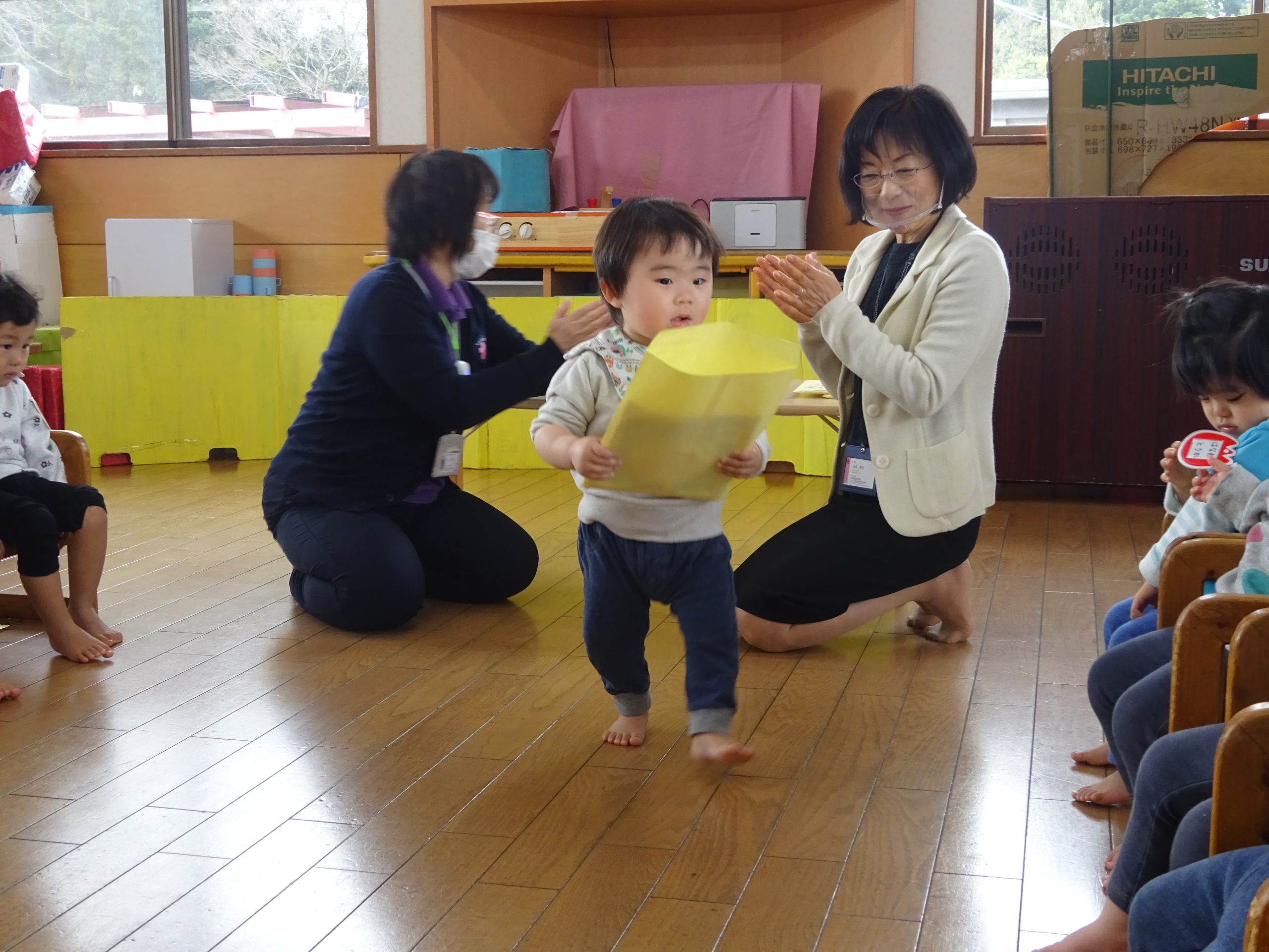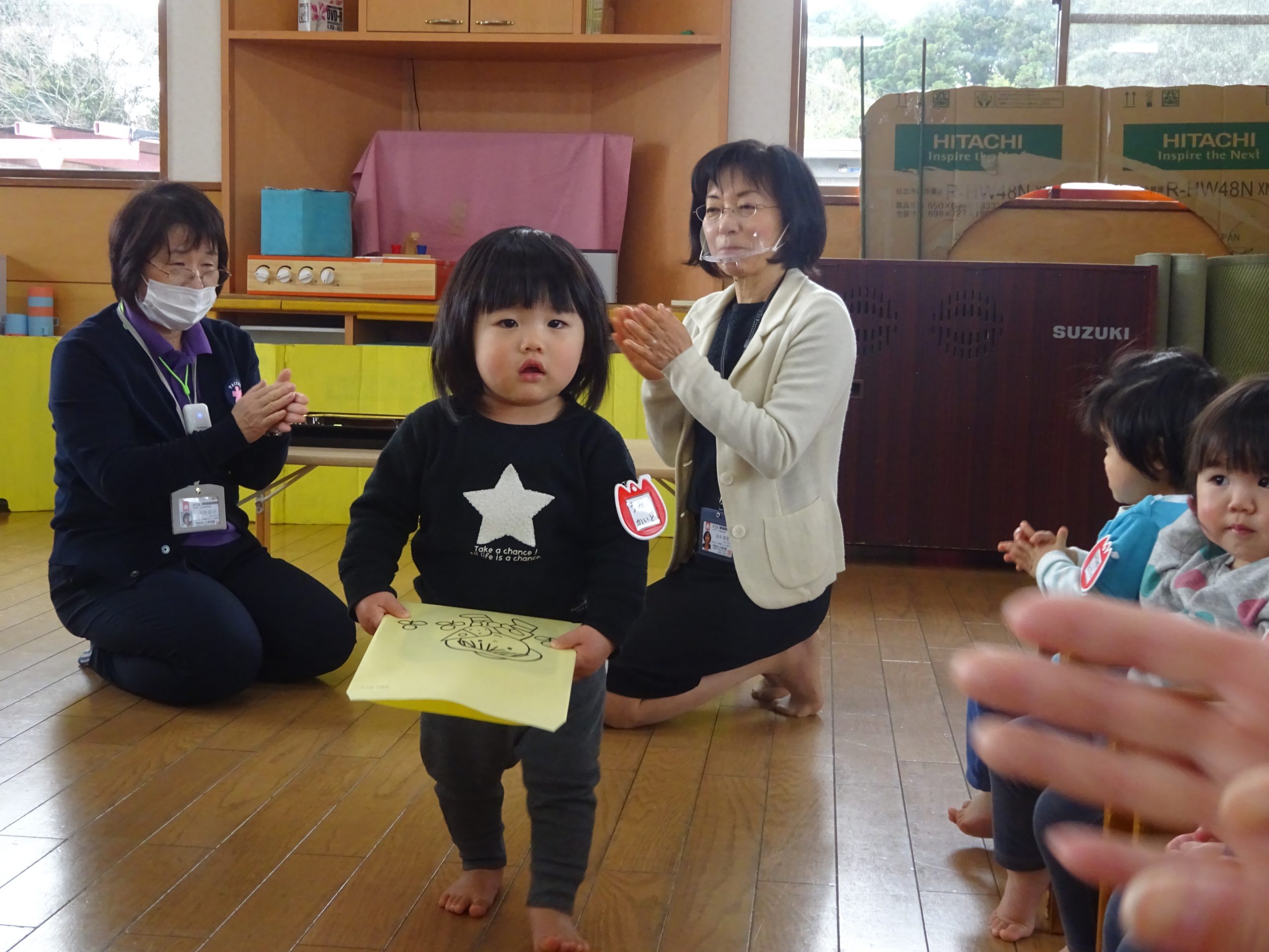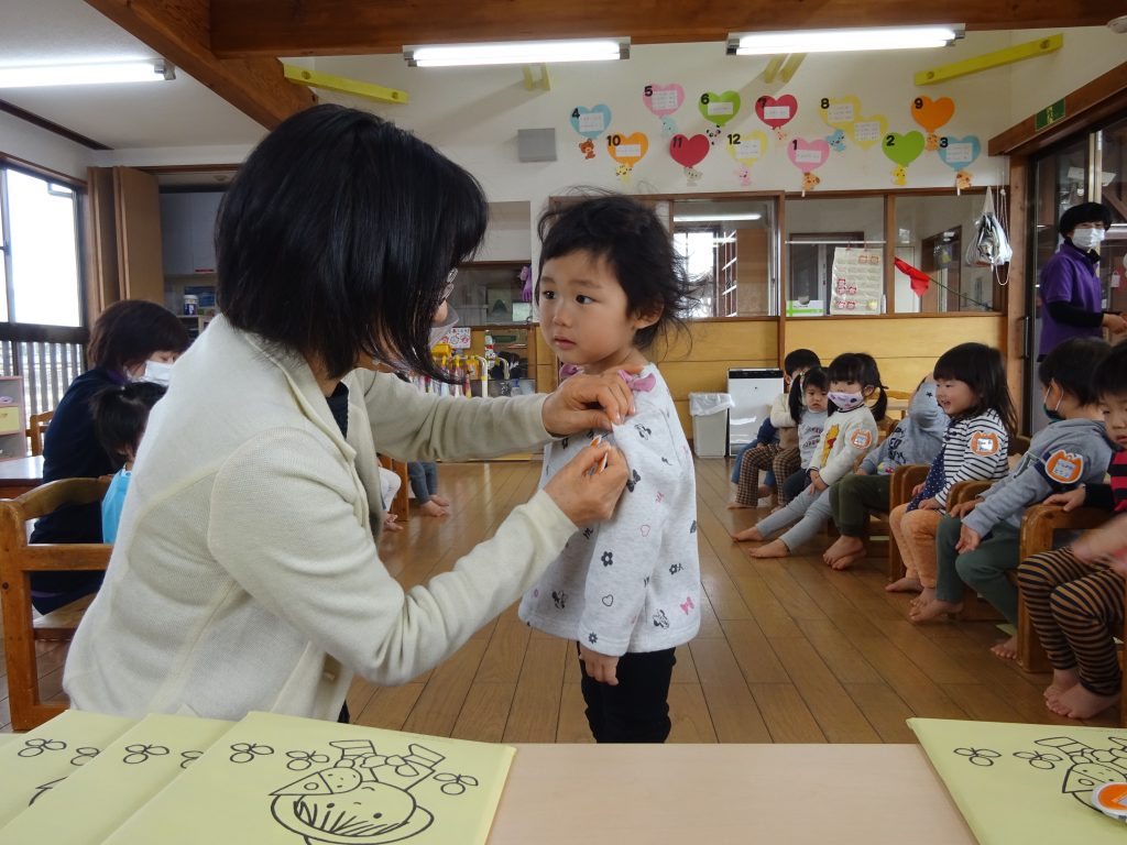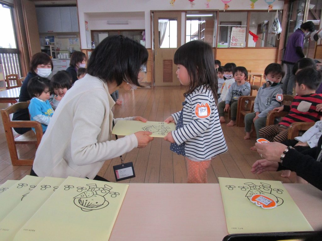 進級式(0・1歳児) 2021 3/23 ニュース 「いってくるね~」とホールに向かうオレンジ(2歳児)さんをバイバイで見送り、いよいよオレンジさんになる雰囲気を感じてきたあか(1歳児)さん。式に備えて返事の練習もバッチリ!!ゆめ(0歳児)さんも椅子にじょうずに座って準備OKです。 進級式が始まると、それぞれにドキドキしている様子でしたが、自分でしっかりオレンジとあかの名札とお祝いの絵本をもらう事が出来ました。 もらった名札をじーっと見てはニコニコ。名前を一日中つけて過ごしました。 ニュース URLをコピーしました! お散歩(4,5歳児) 進級式(2,3,4歳児) コメント コメントする コメントをキャンセルコメント ※ 名前 ※ メール ※ サイト 次回のコメントで使用するためブラウザーに自分の名前、メールアドレス、サイトを保存する。 上に表示された文字を入力してください。 Δ