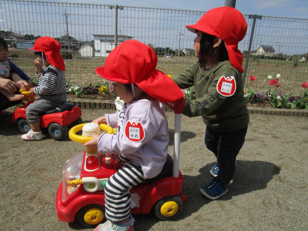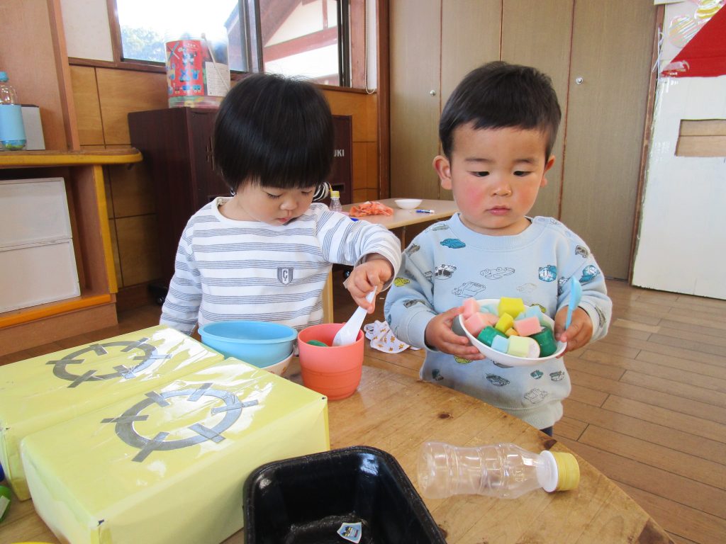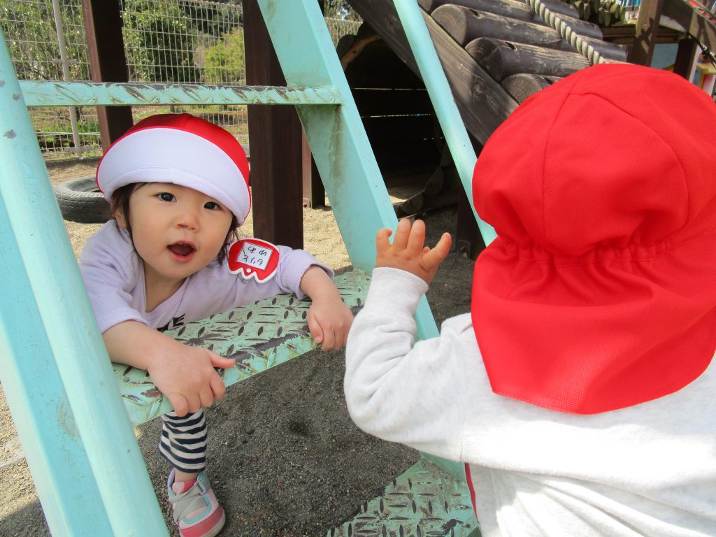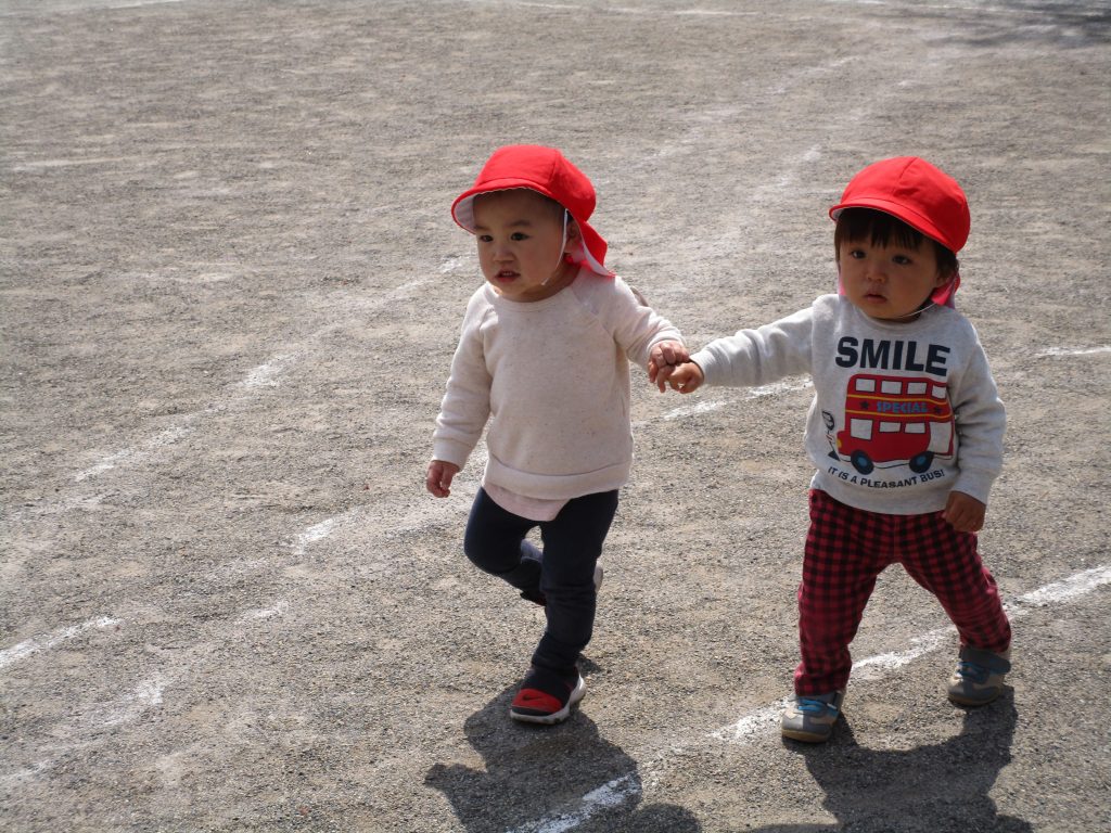 入園・進級をして2週間目!少しずつ園の生活に慣れてきている1歳児。進級児は新しいお友達と手をつないで「一緒に行こう」と言っているかのように遊びへと向かいます。朝お母さんとの別れ際は涙のお友も、夕方には自分のお気に入りを見つけて遊ぶ姿が出てきました。一人一人少しずつ園生活に慣れてきて、笑顔で過ごす時間が増えてきました。