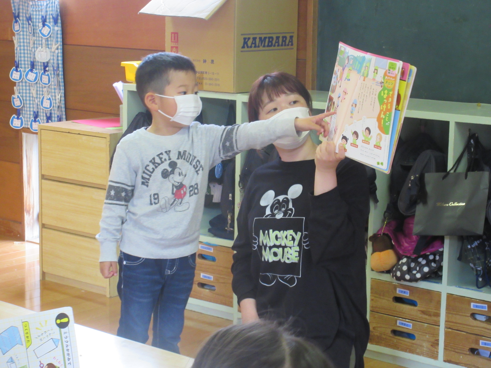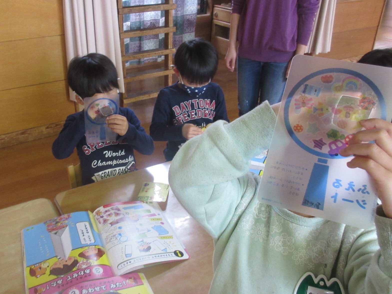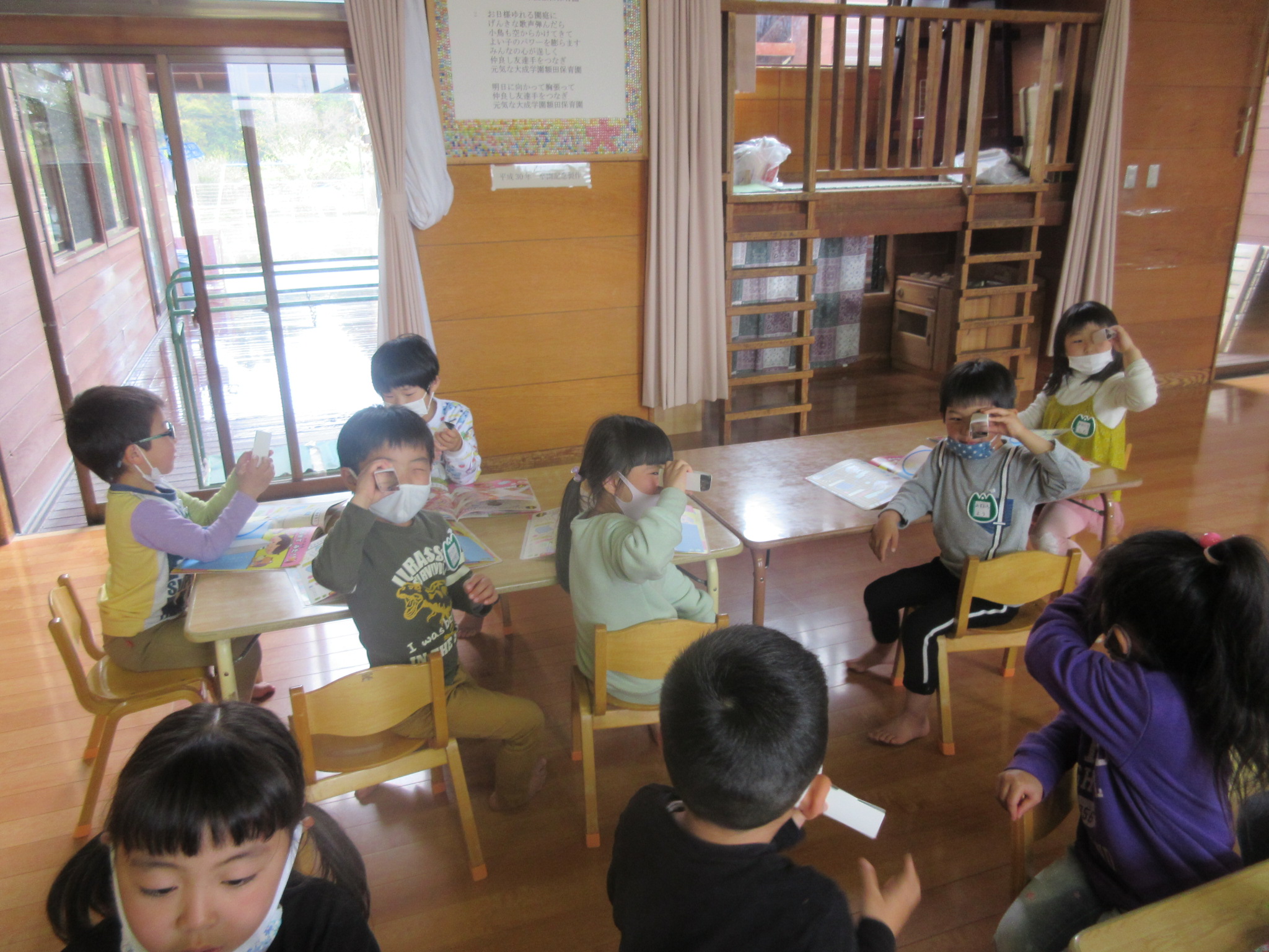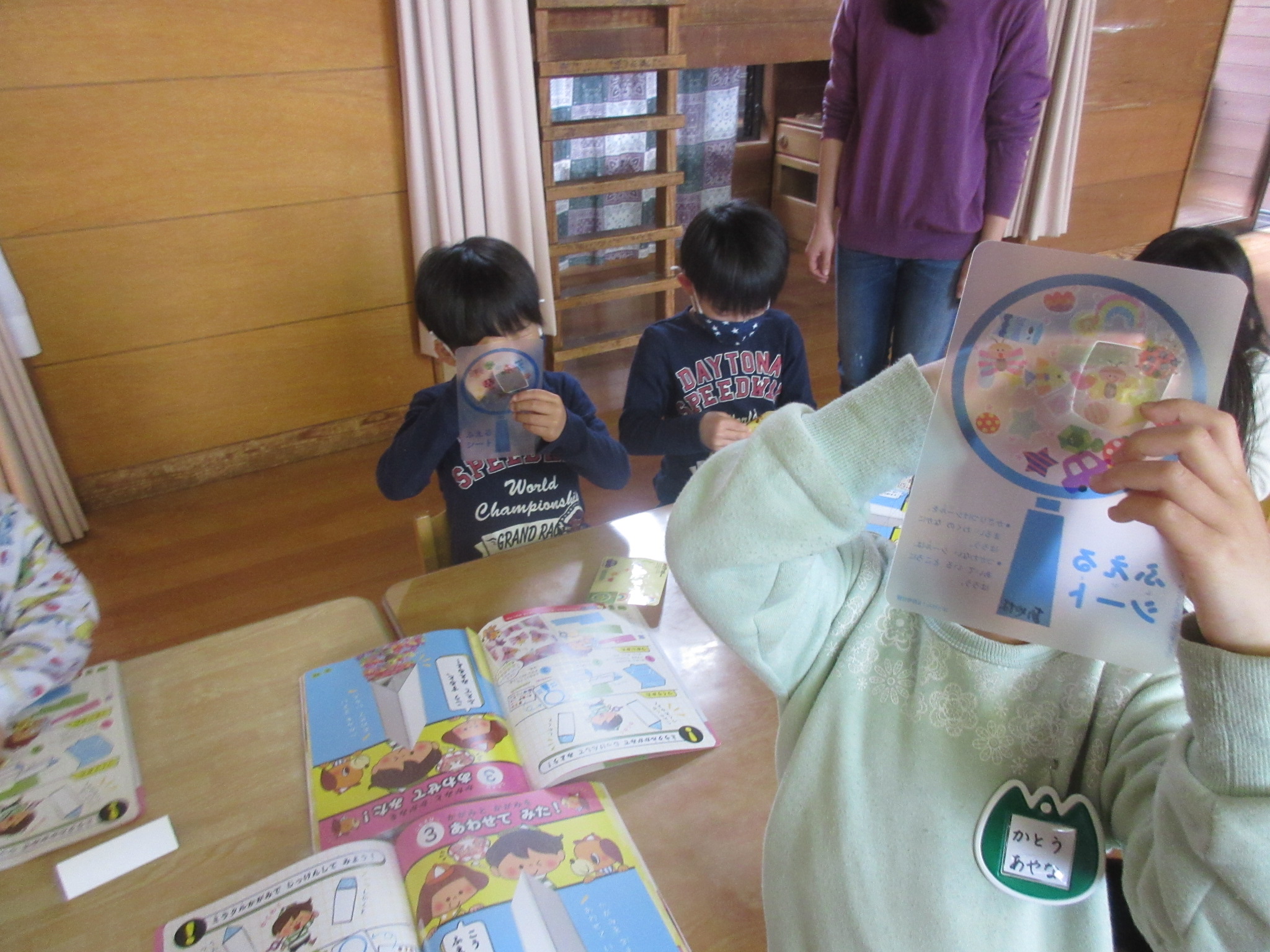 はっけん!(5歳児) 2021 4/14 ニュース 月間絵本が年長さんから総合絵本に変わりました。午後の時間に座学としてとり入れています。子どもたちの気づいたこと見つけたことをみんなの前で発表する場として、色々なテーマにそって理解を深めていきたいと思います。 テーマは”出来ることをはっけん!もっと楽しく過ごせるように人の役に立つことを見つけてみよう” 自分の考えたことを言葉でしっかりと伝えています。 鏡の望遠鏡を作り、物がどんな形に見えるか実験中…。 「同じ形がいっぱい見える」「1つなのに増えた!!」と驚きや発見を楽しんでいます。 ニュース URLをコピーしました! 木登りに挑戦!!(5歳児) 散歩で色々見つけたよ!(5歳児) コメント コメントする コメントをキャンセルコメント ※ 名前 ※ メール ※ サイト 次回のコメントで使用するためブラウザーに自分の名前、メールアドレス、サイトを保存する。 上に表示された文字を入力してください。 Δ