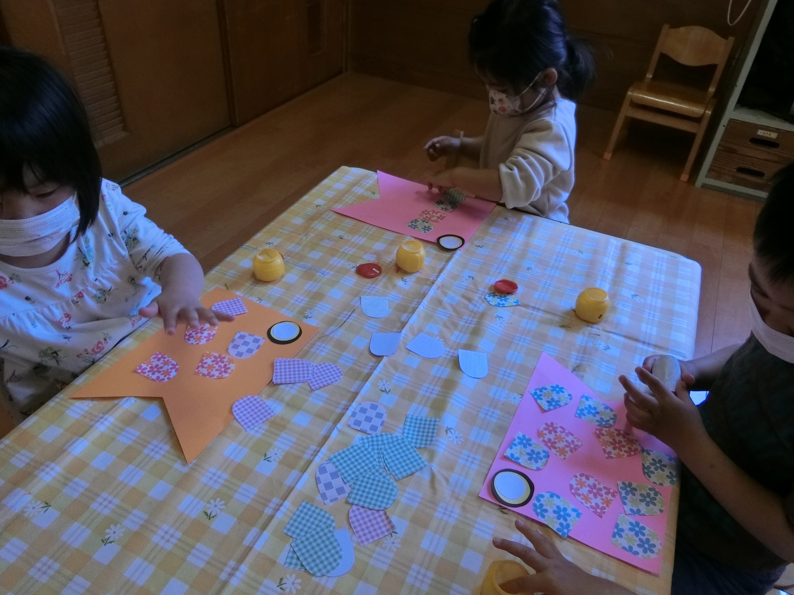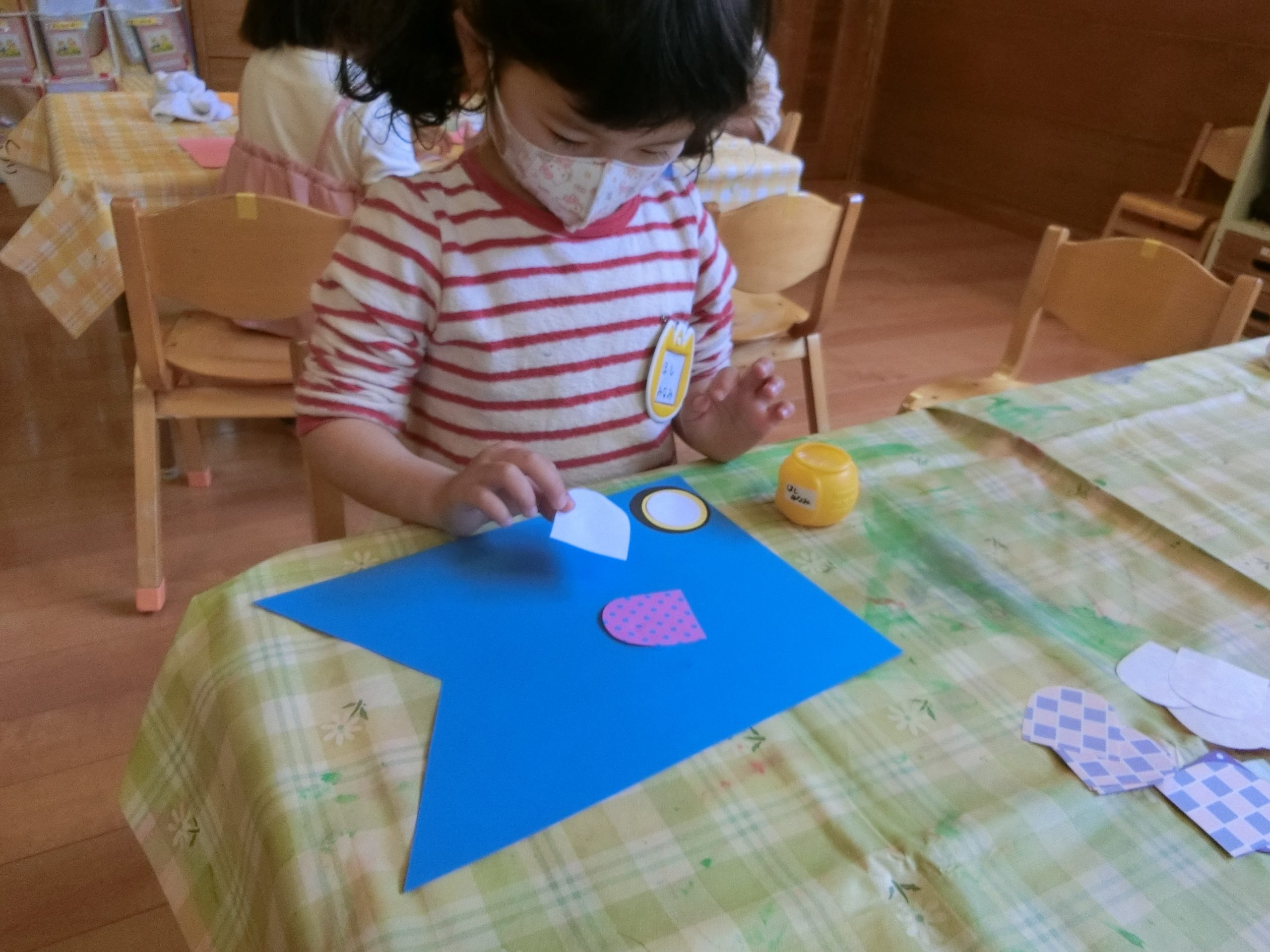 そら組さんのこいのぼり作りを見て、「つき組さんも作りたい!!」とこいのぼり作りがはじまりました。自分ののりを使って一人一人「こいのぼりさんに洋服きせて~」とうれしそうに作っています。完成をおたのしみに~!