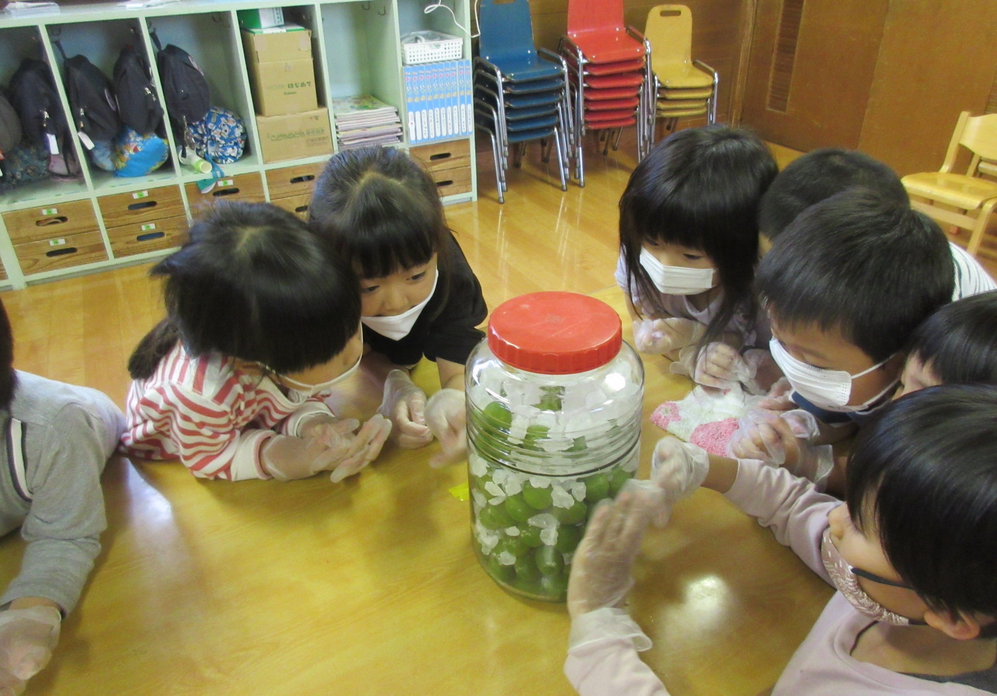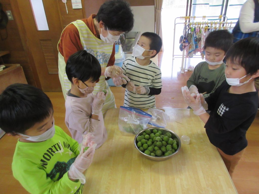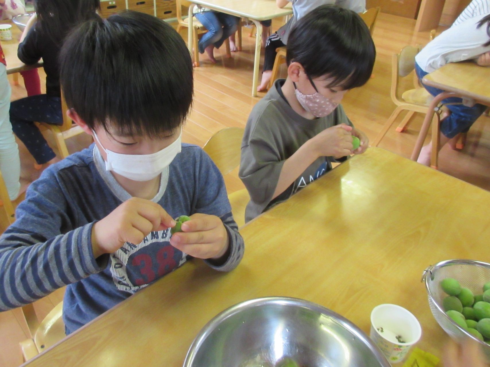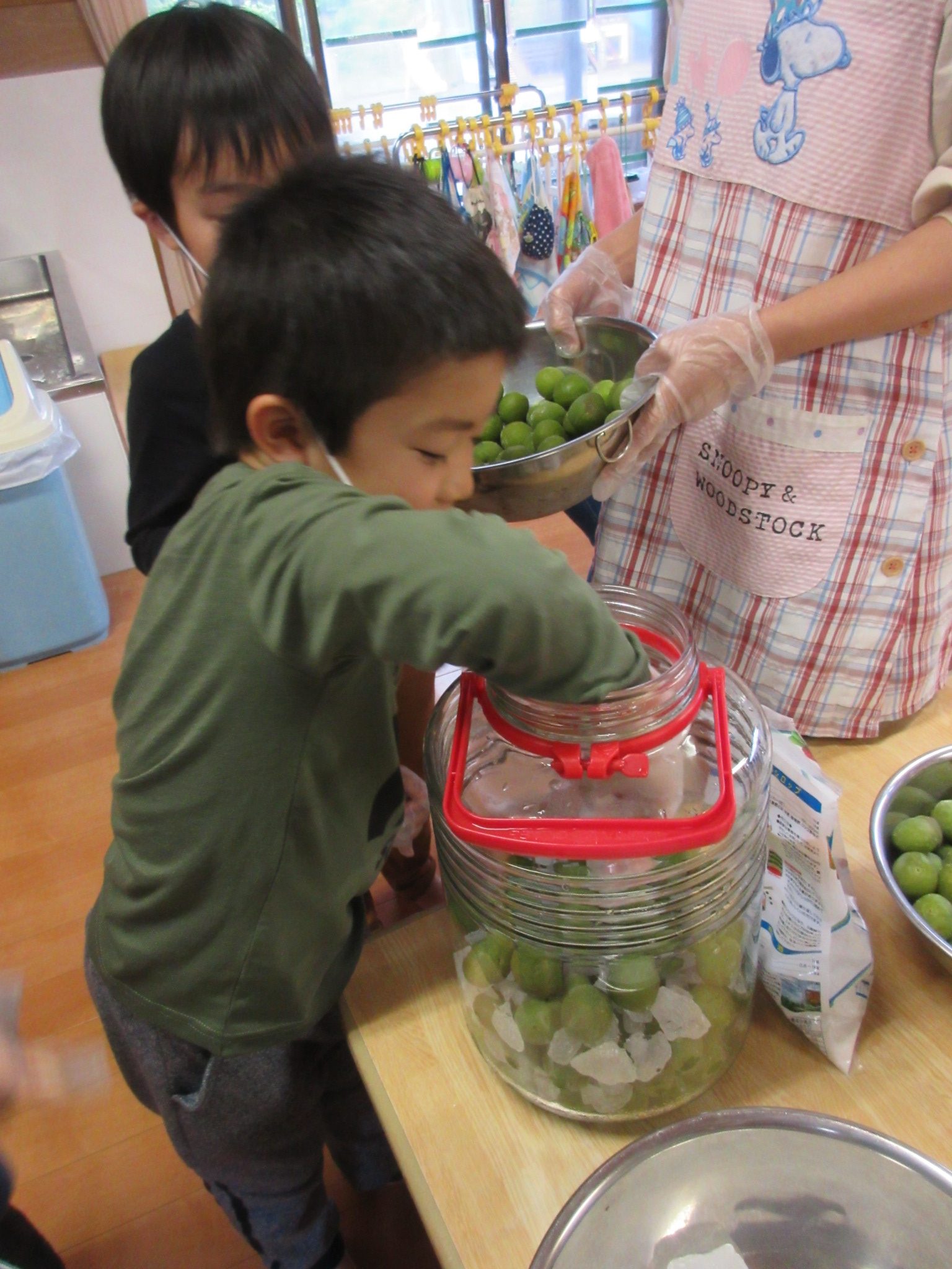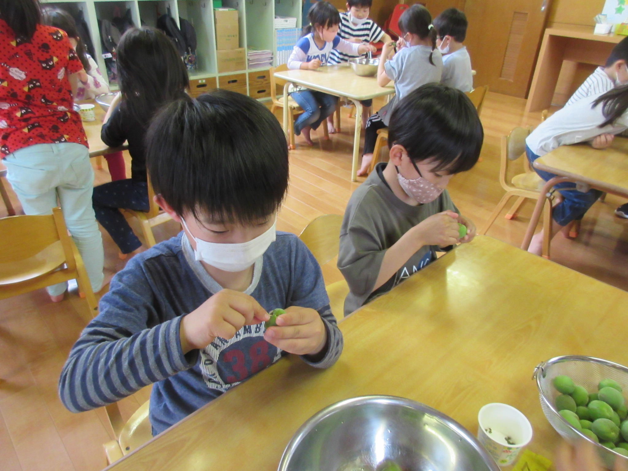 今年は、額田保育園の梅の実がたくさんなりました。年長さんが収穫し、梅ジュース作りが始まりました。梅のヘタをとり、穴を開けていきました。一人一人真剣な顔つきで、細かい工程を集中して行っていました。「どんな味になるのかな?」「梅ジュース早く飲みたいね」と今からワクワクの子どもたちです。
