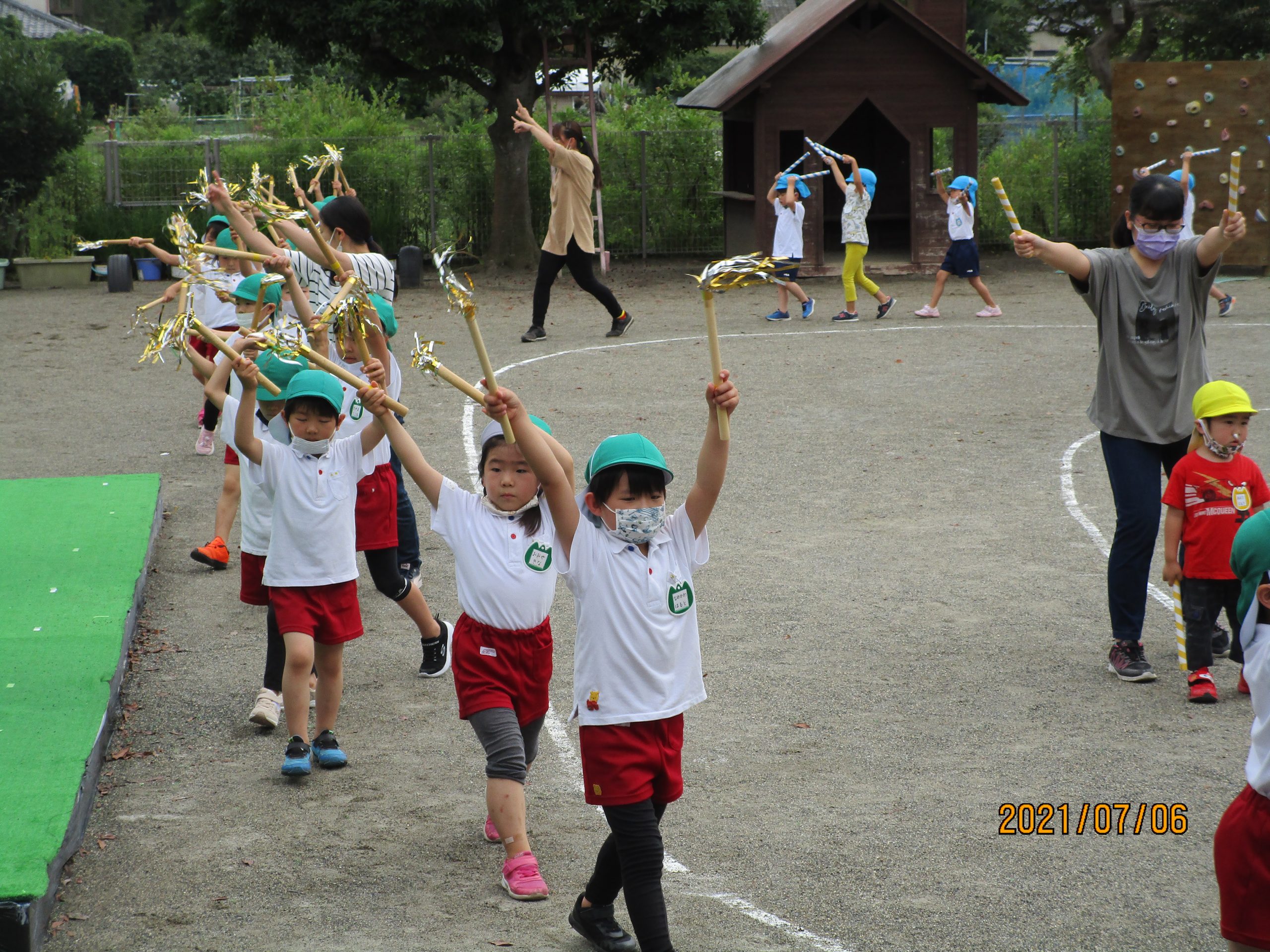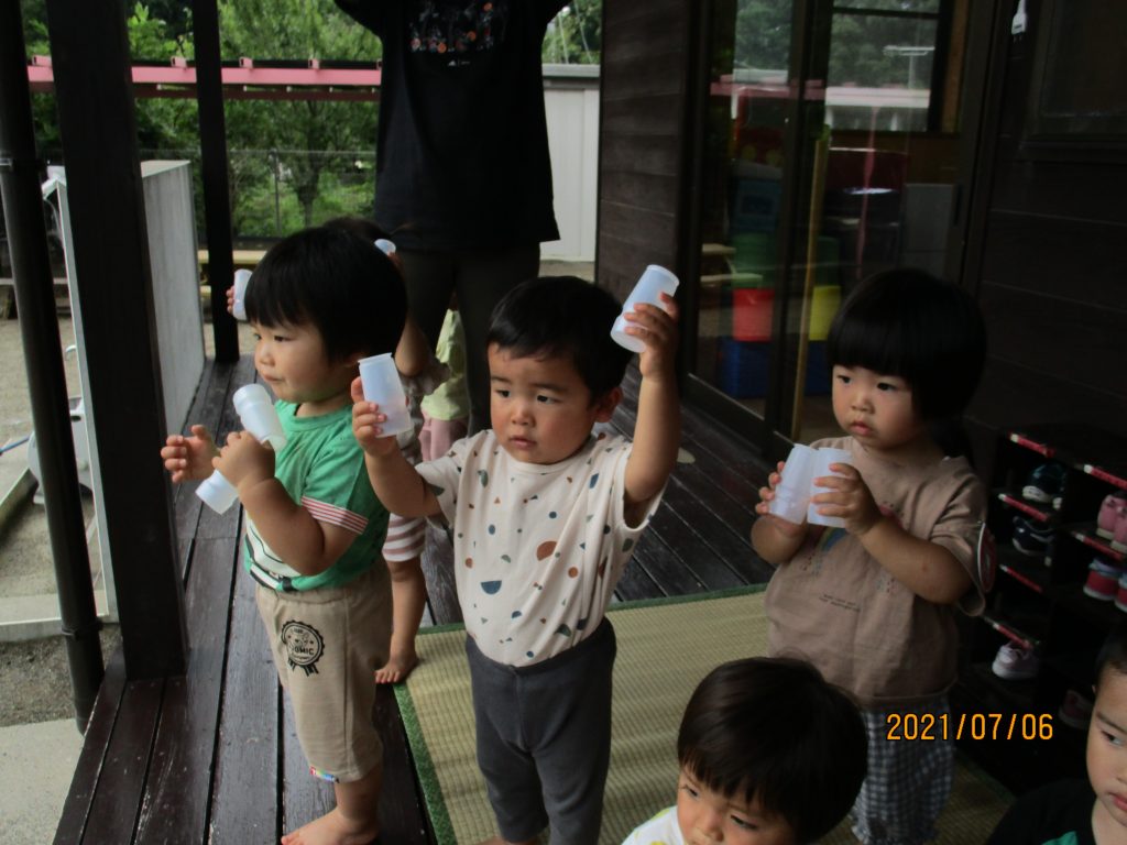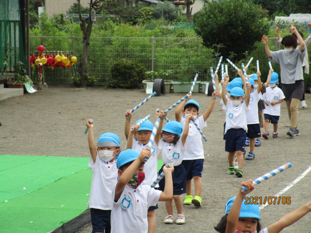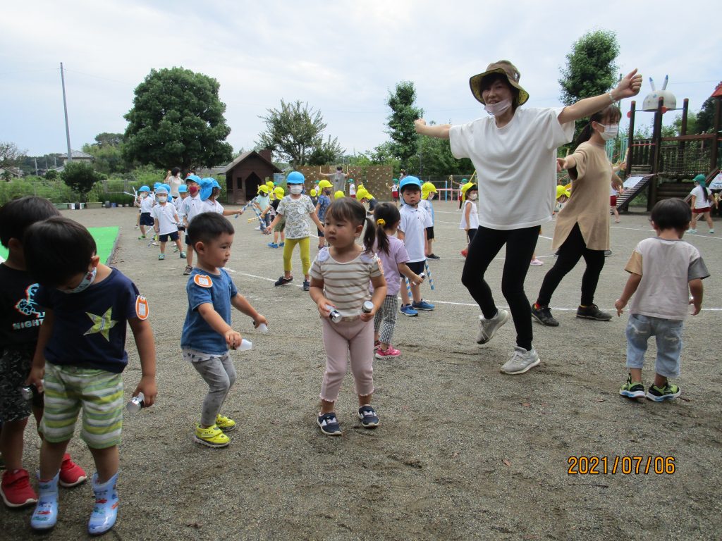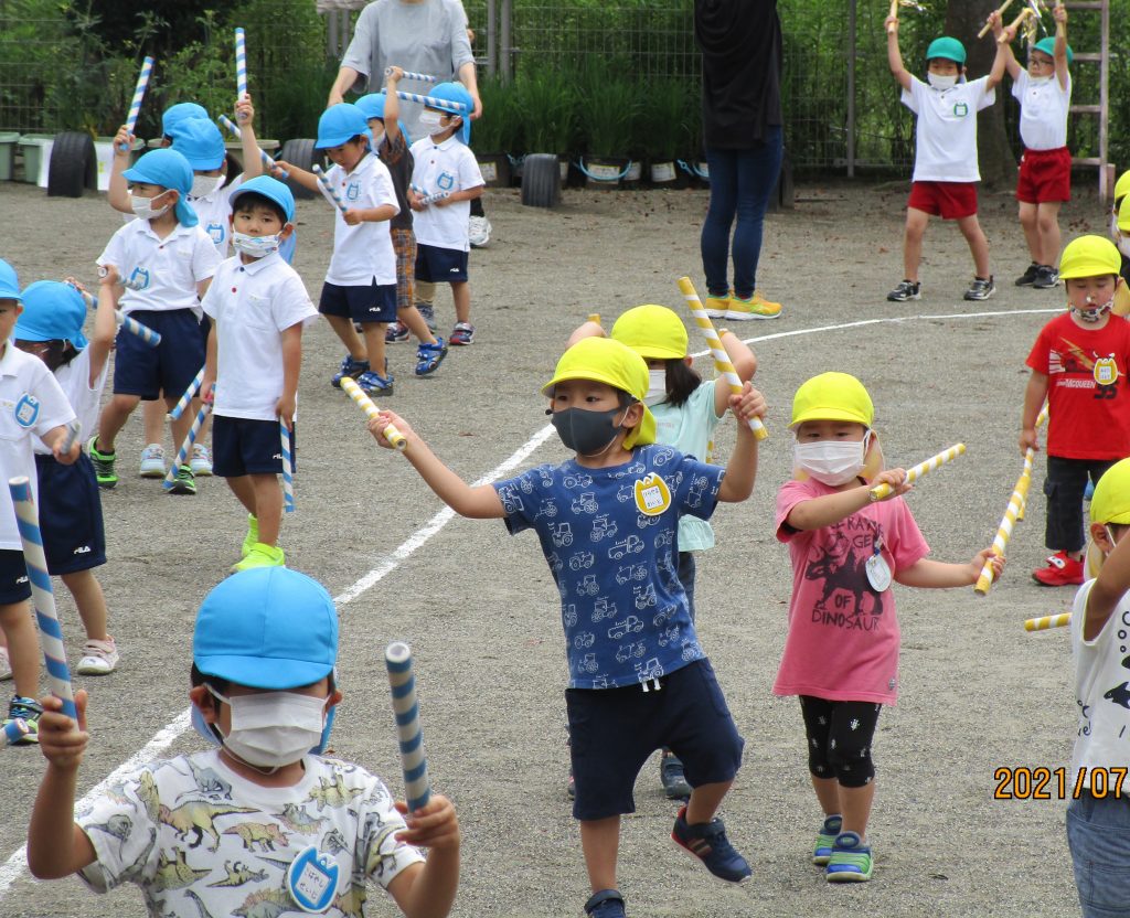 夏祭りへ向けて 2021 7/07 ニュース 楽しみにしていた夏祭りもいよいよ今週末!年長児は「おうちの人にかっこいいところをみせたい」とオープニングの練習をしています。今日はリハーサルを行いました。年長児のかっこよく踊る姿を見て、まねする4歳児(そら組)。バチを持って踊ることが楽しい3歳児(つき組)。先生と一緒に踊りを楽しむ2歳児(ほし組)。祭りの曲が聞こえてくると体を揺らして反応する1歳児。夏祭りへ向けて気持ちが盛り上がっています。 ニュース URLをコピーしました! ジャガイモほり(5歳児) 今年初めての水遊び(3歳児) コメント コメントする コメントをキャンセルコメント ※ 名前 ※ メール ※ サイト 次回のコメントで使用するためブラウザーに自分の名前、メールアドレス、サイトを保存する。 上に表示された文字を入力してください。 Δ